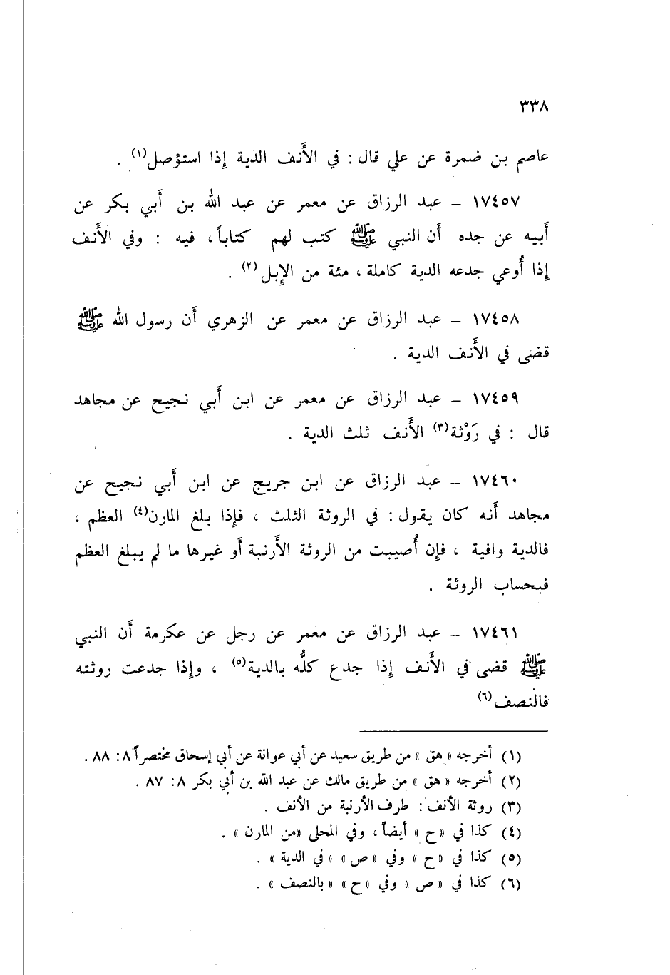 17460 - عَنِ ابْنِ جُرَيْجٍ، عَنِ ابْنِ أَبِي نَجِيحٍ، عَنْ مُجَاهِدٍ، أَنَّهُ كَانَ يَقُولُ: «§فِي الرَّوْثَةِ الثُّلُثُ، فَإِذَا بَلَغَ الْمَارِنُ الْعَظْمَ فَالدِّيَةُ وَافِيَةً، فَإِنْ أُصِيبَتْ مِنَ الرَّوْثَةِ الْأَرْنَبَةُ أَوْ غَيْرُهَا مَا لَمْ يَبْلُغِ الْعَظْمَ فَبِحِسَابِ الرَّوْثَةِ»
