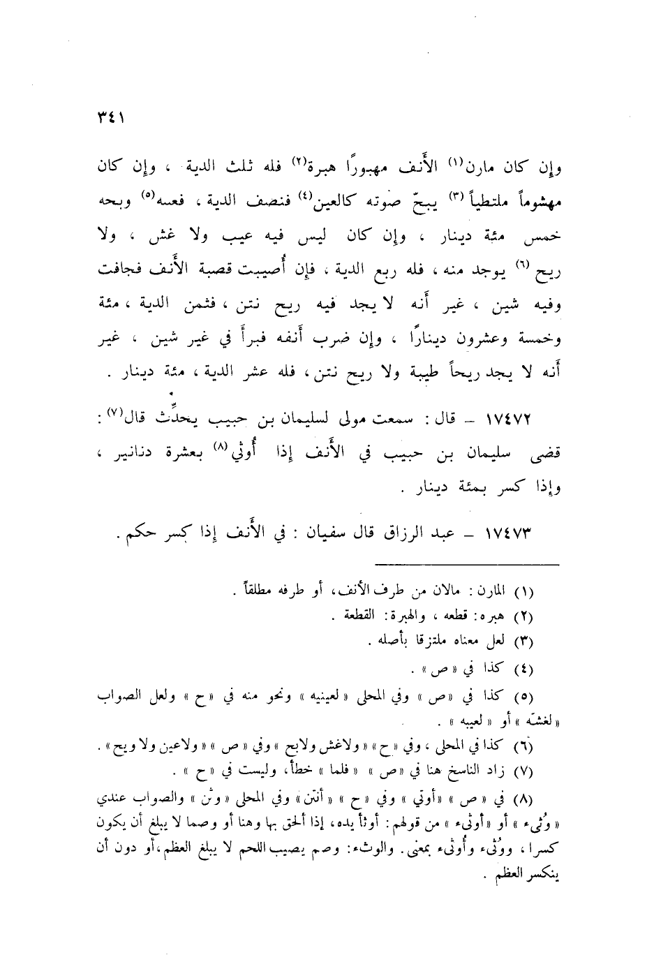 17472 - قَالَ: سَمِعْتُ مَوْلًى لِسُلَيْمَانَ بْنِ حَبِيبٍ يُحَدِّثُ قَالَ: «قَضَى سُلَيْمَانُ بْنُ حَبِيبٍ §فِي الْأَنْفِ إِذَا أُوثِيَ بِعَشَرَةِ دَنَانِيرَ، وَإِذَا كُسِرَ بِمِائَةِ دِينَارٍ»