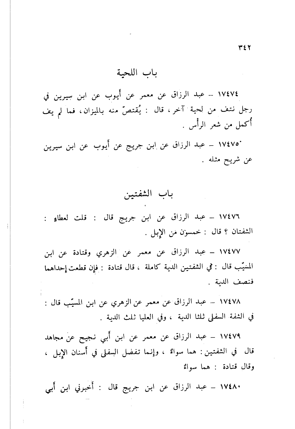 17474 - عَبْدُ الرَّزَّاقِ، عَنْ مَعْمَرٍ، عَنْ أَيُّوبَ، عَنِ ابْنِ سِيرِينَ، §فِي رَجُلٍ نَتَفَ مِنْ لِحْيَةِ آخَرَ قَالَ: «يُقْتَصُّ مِنْهُ بِالْمِيزَانِ فَمَا لَمْ يَفِ أُكْمِلَ مِنْ شَعْرِ الرَّأْسِ»، عَبْدُ الرَّزَّاقِ،
