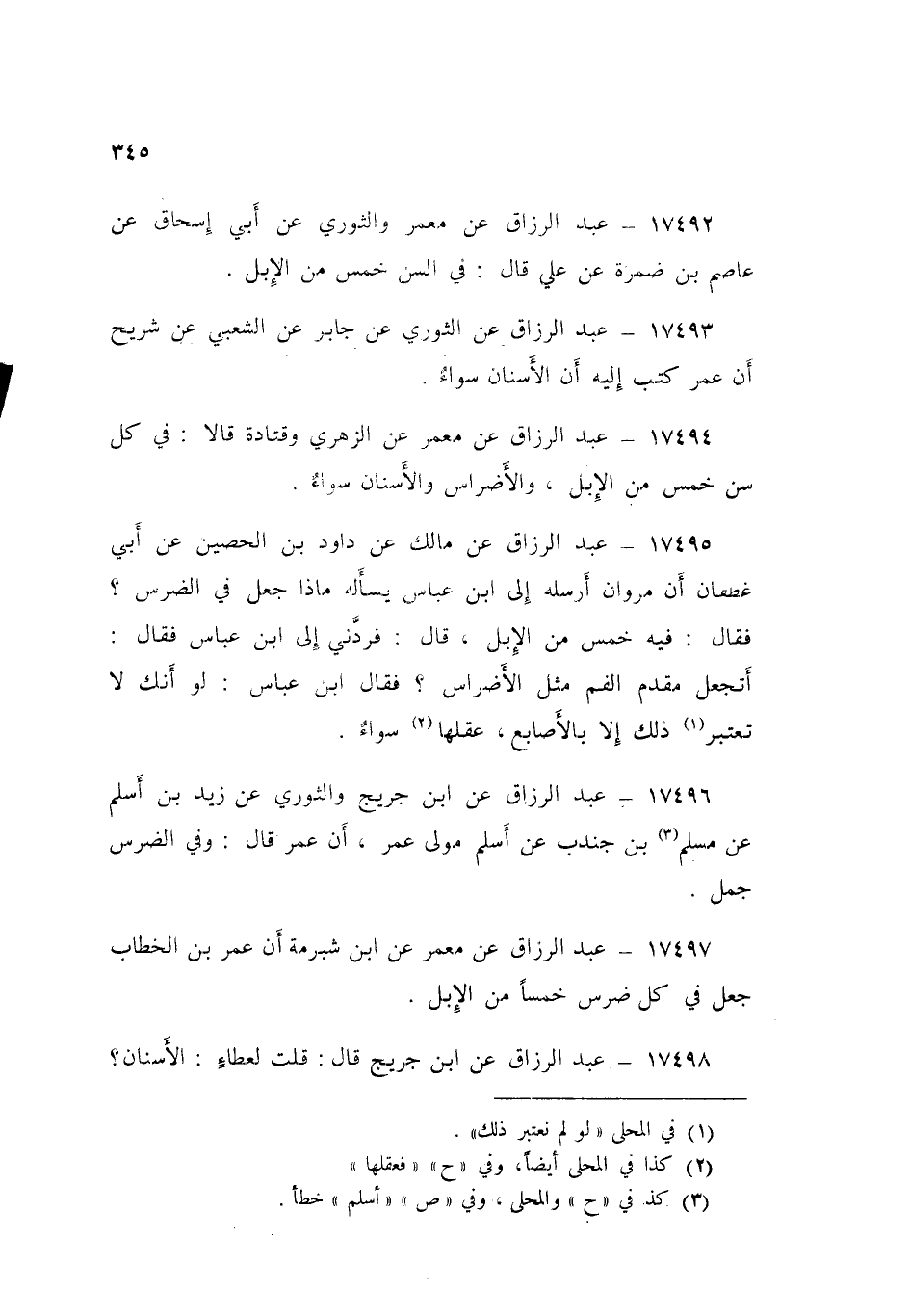 17496 - عَنِ ابْنِ جُرَيْجٍ، وَالثَّوْرِيِّ، عَنْ زَيْدِ بْنِ أَسْلَمَ، عَنْ مُسْلِمِ بْنِ جُنْدُبٍ، عَنْ أَسْلَمَ، مَوْلَى عُمَرَ أَنَّ عُمَرَ قَالَ: «§وَفِي الضِّرْسِ جَمَلٌ»