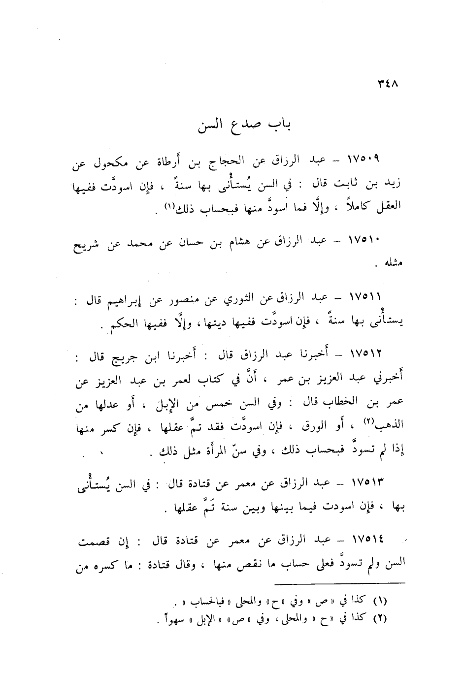 17512 - عَبْدُ الرَّزَّاقِ قَالَ: أَخْبَرَنَا ابْنُ جُرَيْجٍ قَالَ: أَخْبَرَنِي عَبْدُ الْعَزِيزِ بْنُ عُمَرَ أَنَّ فِي كِتَابٍ لِعُمَرَ بْنِ عَبْدِ الْعَزِيزِ، عَنْ عُمَرَ بْنِ الْخَطَّابِ قَالَ: «§وَفِي السِّنِّ خَمْسٌ مِنَ الْإِبِلِ أَوْ عَدْلُهَا مِنَ الذَّهَبِ أَوِ الْوَرِقِ، فَإِنِ اسْوَدَّتْ فَقَدْ تَمَّ عَقْلُهَا، فَإِنْ كُسِرَ مِنْهَا إِذَا لَمْ تَسْوَدَّ فَبِحِسَابِ ذَلِكَ، وَفِي سَنِّ الْمَرْأَةِ مِثْلُ ذَلِكَ»