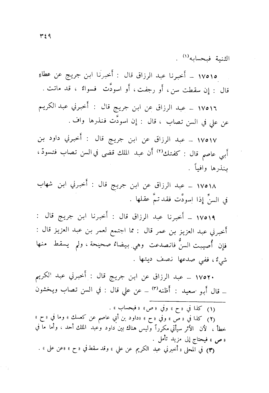 17518 - عَنِ ابْنِ جُرَيْجٍ قَالَ: أَخْبَرَنِي ابْنُ شِهَابٍ، «§فِي السِّنِّ إِذَا اسْوَدَّتْ فَقَدْ تَمَّ عَقْلُهَا»