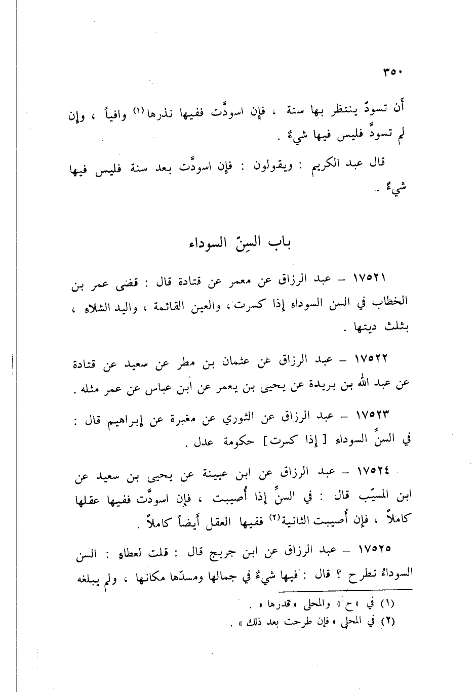 17526 - عَبْدُ الرَّزَّاقِ قَالَ: أَخْبَرَنَا ابْنُ جُرَيْجٍ قَالَ: أَخْبَرَنِي ابْنُ أَبِي نَجِيحٍ، عَنْ مُجَاهِدٍ قَالَ: «§إِنِ اسْوَدَّتِ السِّنُّ أَوْ رَجَفَتْ، ثُمَّ طُرِحَتْ فَنِصْفُ نَذْرِهَا، وَإِنْ كَانَ أَخَذَ فِيهَا نَذْرَهَا أَوَّلَ مَرَّةٍ» وَأَمَّا مَعْمَرٌ فَذَكَرَ عَنِ ابْنِ أَبِي نَجِيحٍ، عَنْ مُجَاهِدٍ فِي السِّنِّ السَّوْدَاءِ رُبُعُ دِيَتِهَا