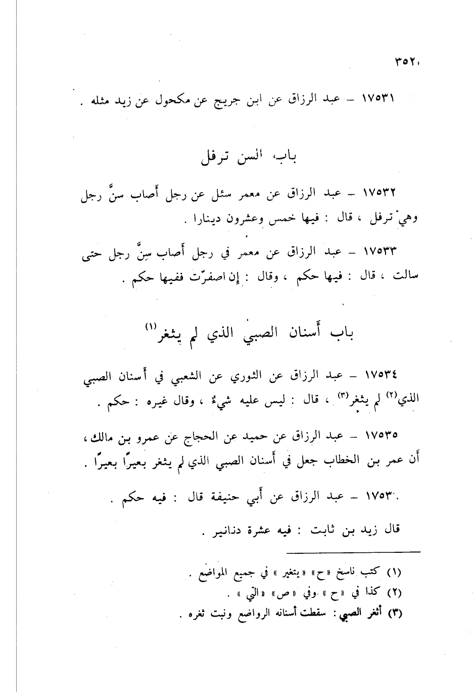 17532 - عَنْ مَعْمَرٍ، سُئِلَ عَنْ رَجُلٍ §أَصَابَ سَنَّ رَجُلٍ وَهِيَ تَرْفُلُ قَالَ: «فِيهَا خَمْسٌ وَعِشْرُونَ دِينَارًا»