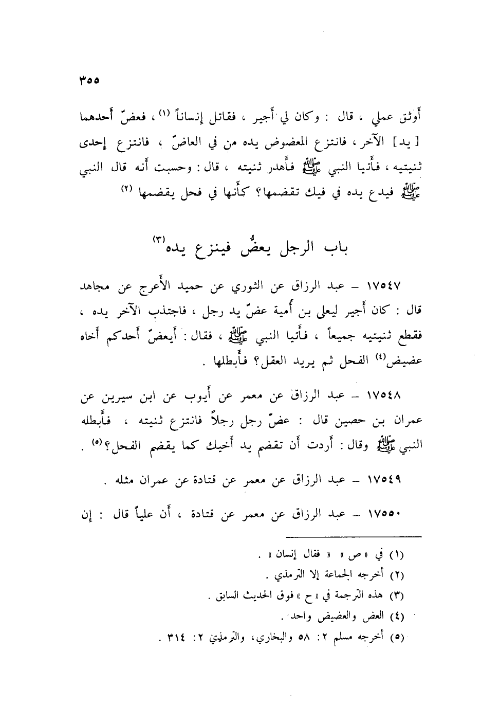 17548 - عَنْ مَعْمَرٍ، عَنْ أَيُّوبَ، عَنِ ابْنِ سِيرِينَ، عَنْ عِمْرَانَ بْنِ حُصَيْنٍ قَالَ: §عَضَّ رَجُلٌ رَجُلًا فَانْتَزَعَ ثَنِيَّتَهُ، فَأَبْطَلَهُ النَّبِيُّ صَلَّى اللهُ عَلَيْهِ وَسَلَّمَ وَقَالَ: «أَرَدْتَ أَنَّ تَقْضَمَ يَدَ أَخِيكَ كَمَا يَقْضِمُ الْفَحْلُ»، عَبْدُ الرَّزَّاقِ،