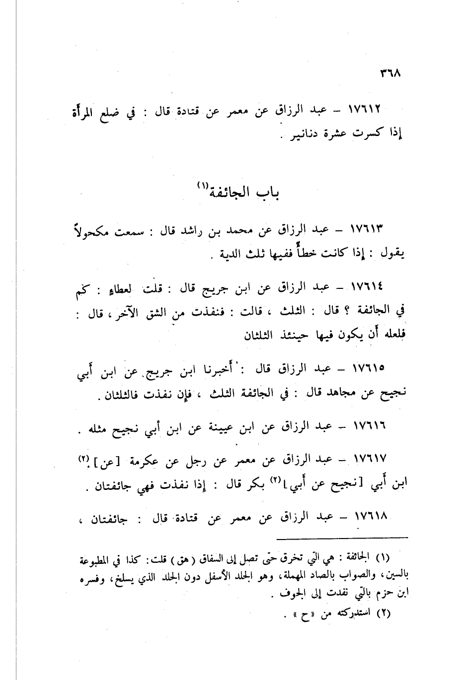 17618 - عَنْ مَعْمَرٍ، عَنْ قَتَادَةَ قَالَ: «§جَائِفَتَانِ فَفِيهِمَا ثُلُثَا الدِّيَةِ»