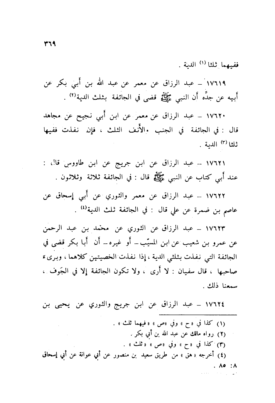 17621 - عَنِ ابْنِ جُرَيْجٍ، عَنِ ابْنِ طَاوُسٍ قَالَ: عِنْدَ أَبِي كِتَابٌ عَنِ النَّبِيِّ صَلَّى اللهُ عَلَيْهِ وَسَلَّمَ قَالَ: «§فِي الْجَائِفَةِ ثَلَاثَةً وَثَلَاثُونَ»