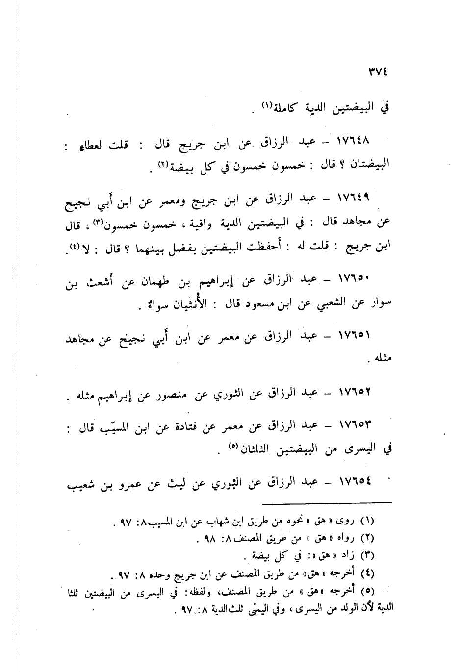 17649 - عَنِ ابْنِ جُرَيْجٍ، وَمَعْمَرٍ، عَنِ ابْنِ أَبِي نَجِيحٍ، عَنْ مُجَاهِدٍ قَالَ: «§فِي الْبَيْضَتَيْنِ الدِّيَةُ، وَافِيَةً خَمْسُونَ خَمْسُونَ» قَالَ ابْنُ جُرَيْجٍ: قُلْتُ لَهُ: أَحَفِظْتَ الْبَيْضَتَيْنِ يَفَضَّلُ بَيْنَهُمَا؟ قَالَ: «لَا»