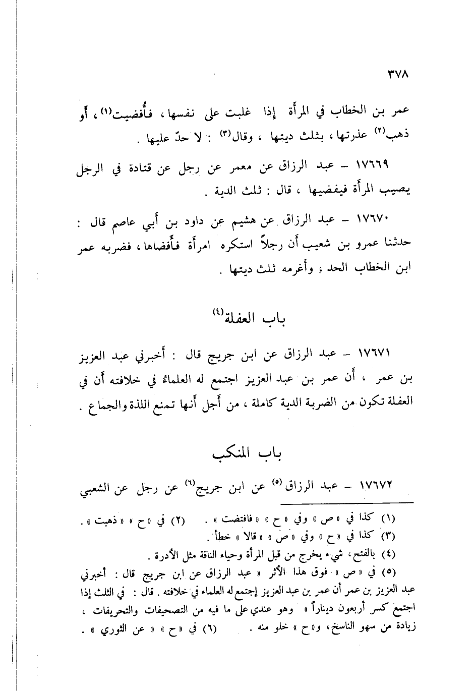 17671 - عَنِ ابْنِ جُرَيْجٍ قَالَ: أَخْبَرَنِي عَبْدُ الْعَزِيزِ بْنُ عُمَرَ، أَنَّ عُمَرَ بْنَ عَبْدِ الْعَزِيزِ اجْتَمَعَ لَهُ الْعُلَمَاءُ فِي خِلَافَتِهِ «§أَنَّ فِي الْعَفَلَةِ تَكُونُ مِنَ الضَّرْبَةِ الدِّيَةُ كَامِلَةً مِنْ أَجْلِ أَنَّهَا تَمْنَعُ اللَّذَّةَ وَالْجِمَاعَ»