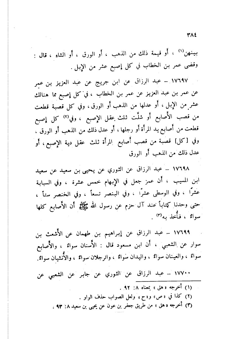 17698 - عَنِ الثَّوْرِيِّ، عَنْ يَحْيَى بْنِ سَعِيدٍ، عَنْ سَعِيدِ بْنِ الْمُسَيِّبِ، أَنَّ عُمَرَ، جَعَلَ فِي الْإِبْهَامِ خَمْسَ عَشْرَةَ، وَفِي السَّبَّابَةِ عَشْرًا، وَفِي الْوُسْطَى عَشْرًا، وَفِي الْبِنْصَرِ تِسْعًا، وَفِي الْخِنْصَرِ سِتًّا، حَتَّى وَجَدْنَا كِتَابًا عِنْدَ آلِ حَزْمٍ عَنْ رَسُولِ اللَّهِ صَلَّى اللهُ عَلَيْهِ وَسَلَّمَ: «§أَنَّ الْأَصَابِعَ كُلَهَا سَوَاءٌ فَأَخَذَ بِهِ»
