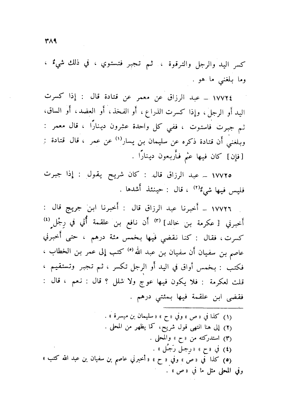 17726 - عَبْدُ الرَّزَّاقِ قَالَ: أَخْبَرَنَا ابْنُ جُرَيْجٍ قَالَ: أَخْبَرَنِي عِكْرِمَةُ بْنُ خَالِدٍ، أَنَّ نَافِعَ بْنَ عَلْقَمَةَ، أُتِيَ فِي رِجْلٍ كُسِرَتْ، فَقَالَ: كُنَّا نَقْضِي فِيهِ بِخَمْسِمِائَةِ دِرْهَمٍ، حَتَّى أَخْبَرَنِي عَاصِمُ بْنُ سُفْيَانَ، أَنَّ سُفْيَانَ بْنَ عَبْدِ اللَّهِ كَتَبَ إِلَى عُمَرَ بْنِ الْخَطَّابِ «§فَكَتَبَ بِخَمْسِ أَوْاقٍ فِي الْيَدِ، أَوِ الرِّجْلِ تُكْسَرُ، ثُمَّ تُجْبَرُ وَتَسْتَقِيمُ»، قُلْتُ لِعِكْرِمَةَ: فَلَا يَكُونُ فِيهِ عِوَجٌ وَلَا شَلَلٌ؟ قَالَ: «نَعَمْ» قَالَ: فَقَضَى ابْنُ عَلْقَمَةَ فِيهِ بِمِائَتَيْ دِرْهَمٍ