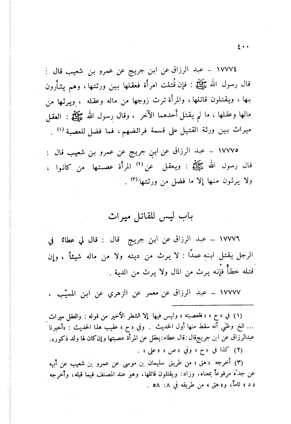 17777 - عَنْ مَعْمَرٍ، عَنِ الزُّهْرِيِّ، عَنِ ابْنِ الْمُسَيِّبِ، وَعَنِ ابْنِ أَبِي نَجِيحٍ، عَنْ مُجَاهِدٍ، قَالَا: «§مَنْ قَتَلَ رَجُلًا خَطَأً فَإِنَّهُ يَرِثُ مِنْ مَالِهِ، وَلَا يَرِثُ مِنْ دِيَتِهِ، فَإِنْ قَتَلَهُ عَمْدًا لَمْ يَرِثْ مِنْ مَالِهِ، وَلَا مِنْ دِيَتِهِ»