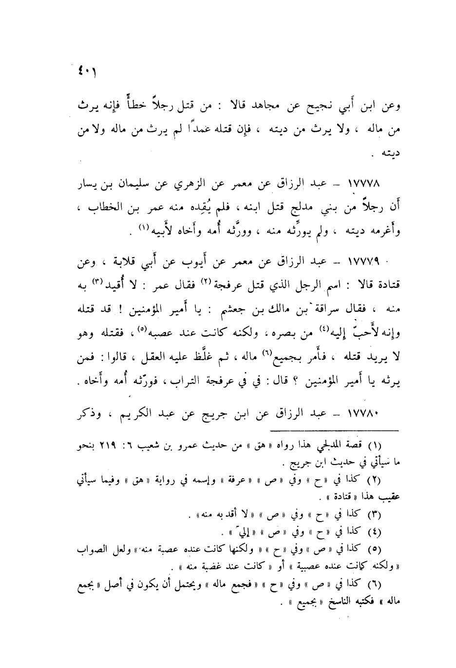 17779 - عَنْ مَعْمَرٍ، عَنْ أَيُّوبَ، عَنْ أَبِي قِلَابَةَ، وَعَنْ قَتَادَةَ، قَالَا: اسْمُ الرَّجُلِ الَّذِي قَتَلَ عَرْفَجَةُ فَقَالَ عُمَرُ: «لَا أُقِيدُ بِهِ مِنْهُ» فَقَالَ سُرَاقَةُ بْنُ مَالِكِ بْنِ جُعْشُمٍ: يَا أَمِيرَ الْمُؤْمِنِينَ قَدْ قَتَلَهُ وَإِنَّهُ لَأَحَبُّ إِلَيْهِ مِنْ بَصَرِهِ، وَلَكِنَّهُ كَانَتْ عِنْدَهُ عَصَبِيَّةٌ فَقَتَلَهُ، وَهُوَ لَا يُرِيدُ قَتَلَهُ فَأَمَرَ بِجَمِيعِ مَالِهِ، ثُمَّ غَلَّظَ عَلَيْهِ الْعَقْلَ قَالُوا: فَمَنْ يَرِثُهُ يَا أَمِيرَ الْمُؤْمِنِينَ؟ قَالَ: «§فِي عَرْفَجَةَ التُّرَابُ فَوَرَّثَهُ أُمَّهُ وَأَخَاهُ»