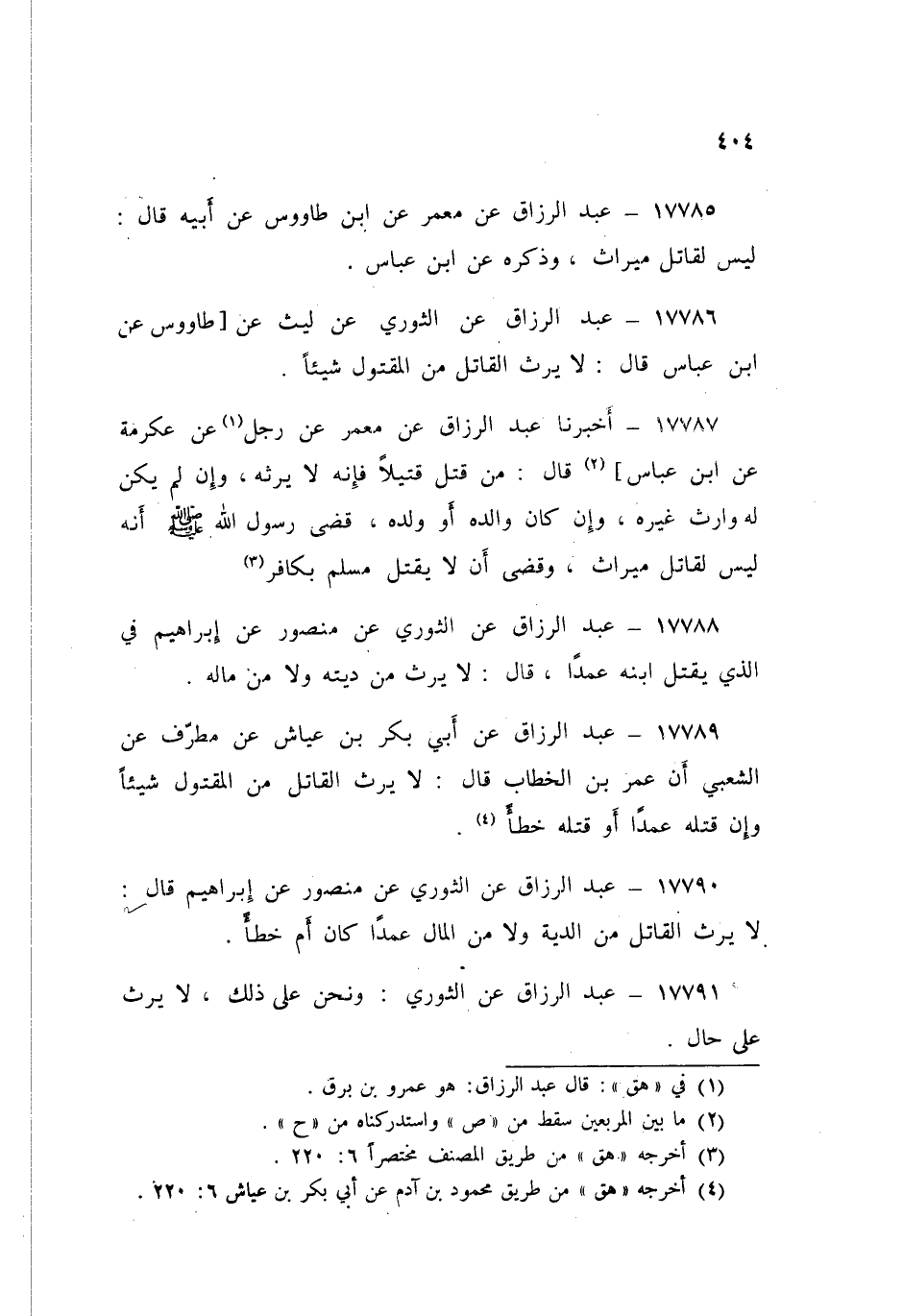 17786 - عَنِ الثَّوْرِيِّ، عَنْ لَيْثٍ، عَنْ طَاوُسٍ، عَنِ ابْنِ عَبَّاسٍ قَالَ: «§لَا يَرِثُ الْقَاتِلُ مِنَ الْمَقْتُولِ شَيْئًا»