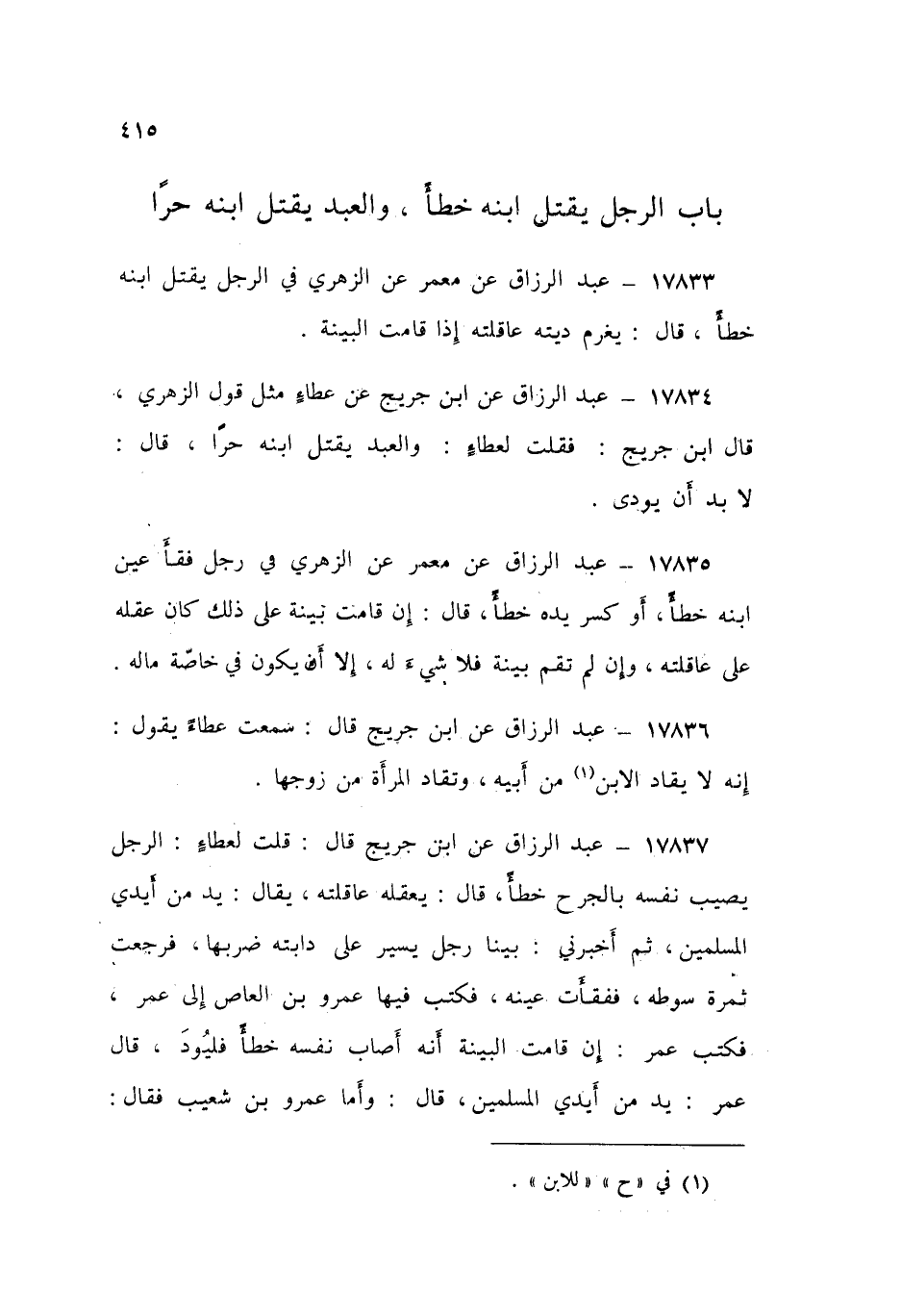 17834 - عَنِ ابْنِ جُرَيْجٍ، عَنْ عَطَاءٍ، مِثْلَ قَوْلِ الزُّهْرِيِّ: قَالَ ابْنُ جُرَيْجٍ: فَقُلْتُ لِعَطَاءٍ: §وَالْعَبْدُ يَقْتُلُ ابْنَهُ حُرًّا؟ قَالَ: «لَا بُدَّ أَنْ يُودَى»