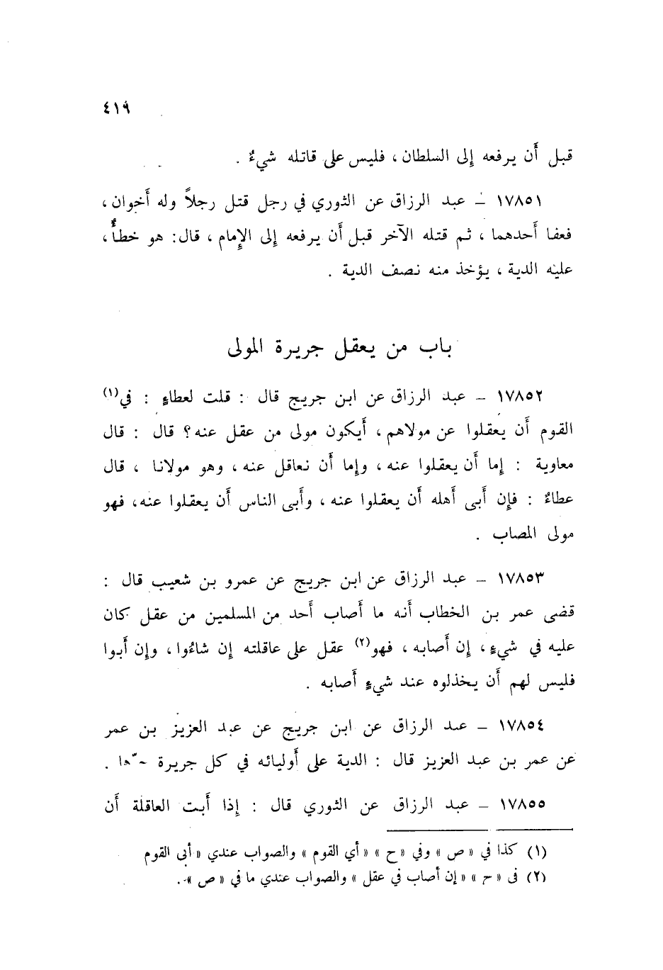 17853 - عَنِ ابْنِ جُرَيْجٍ، عَنْ عَمْرِو بْنِ شُعَيْبٍ قَالَ: «قَضَى عُمَرُ بْنُ الْخَطَّابِ أَنَّهُ §مَا أَصَابَ أَحَدٌ مِنَ الْمُسْلِمِينَ مِنْ عَقْلٍ، كَانَ عَلَيْهِ فِي شَيْءٍ إِنْ أَصَابَهُ فَهُوَ عَقْلٌ عَلَى عَاقِلَتِهِ، إِنْ شَاءُوا، وَإِنْ أَبَوْا فَلَيْسَ لَهُمْ أَنْ يَخْذِلُوهُ عِنْدَ شَيْءٍ أَصَابَهُ»