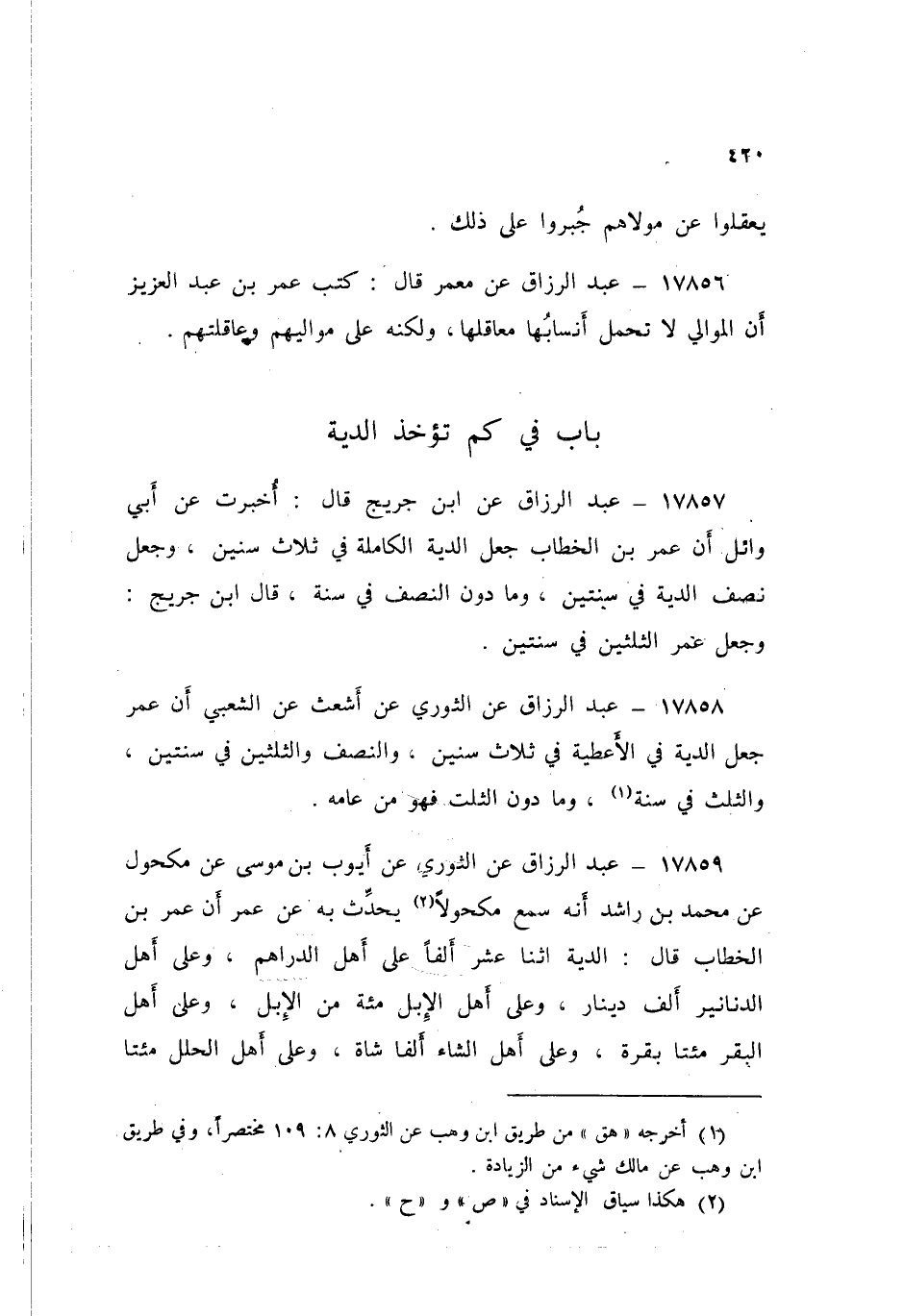 17859 - عَنِ الثَّوْرِيِّ، عَنْ أَيُّوبَ بْنِ مُوسَى، عَنْ مَكْحُولٍ، عَنْ مُحَمَّدِ بْنِ رَاشِدٍ، أَنَّهُ سَمِعَ مَكْحُولًا يُحَدِّثُ بِهِ عَنْ عُمَرَ، أَنَّ عُمَرَ بْنَ الْخَطَّابِ قَالَ: «§الدِّيَةُ اثْنَا عَشَرَ أَلْفًا عَلَى أَهْلِ الدَّرَاهِمِ، وَعَلَى أَهْلِ الدَّنَانِيرِ أَلْفُ دِينَارٍ، وَعَلَى أَهْلِ الْإِبِلِ مِائَةٌ مِنَ الْإِبِلِ، وَعَلَى أَهْلِ الْبَقَرِ مِائَتَا بَقَرَةٍ، وَعَلَى أَهْلِ الشَّاءِ أَلْفًا شَاةٍ، وَعَلَى أَهْلِ الْحُلَلِ مِائَتَا حُلَّةٍ، وَقَضَى بِالدِّيَةِ الثُّلُثَيْنِ فِي سَنَتَيْنِ، وَالنِّصْفَ فِي سَنَتَيْنِ، وَالثُّلُثَ فِي سَنَةٍ، وَمَا كَانَ أَقَلَّ مِنَ الثُّلُثِ فَهُوَ فِي عَامِهِ ذَلِكَ»