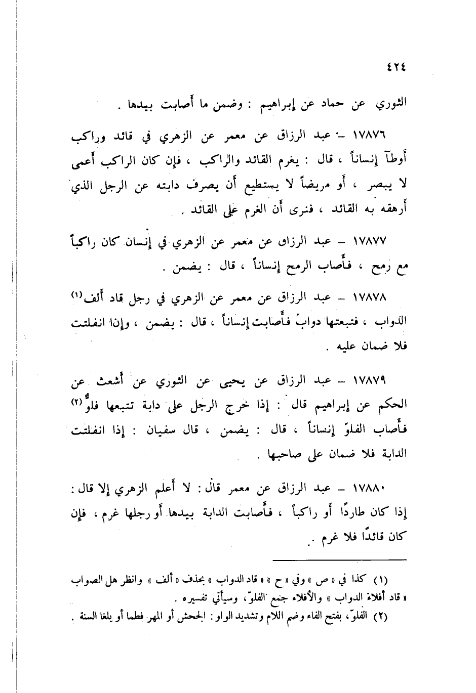 17880 - عَنْ مَعْمَرٍ، قَالَ: لَا أَعْلَمُ الزُّهْرِيَّ إِلَّا قَالَ: «§إِذَا كَانَ طَارِدًا أَوْ رَاكِبًا، فَأَصَابَتِ الدَّابَّةُ بِيَدِهَا، أَوْ رِجْلِهَا غُرِمَ، فَإِنْ كَانَ قَائِدًا فَلَا غُرْمَ»