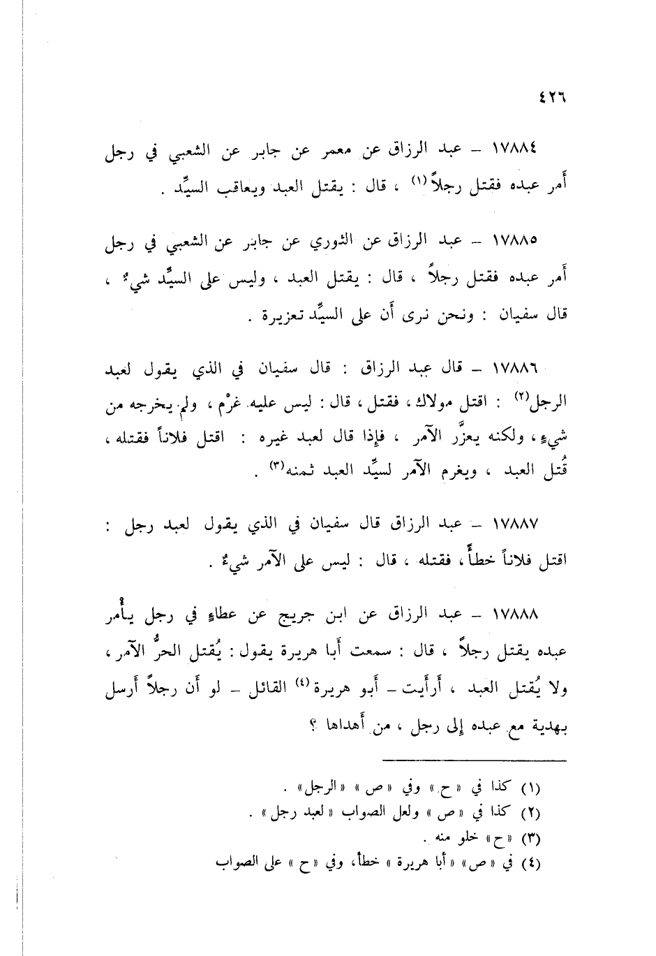 17888 - عَنِ ابْنِ جُرَيْجٍ، عَنْ عَطَاءٍ فِي رَجُلٍ يَأْمُرُ عَبْدَهُ يَقْتُلُ رَجُلًا قَالَ: سَمِعْتُ أَبَا هُرَيْرَةَ يَقُولُ: «§يُقْتَلُ الْحُرُّ الْآمِرَ، وَلَا يُقْتَلُ الْعَبْدُ»، أَرَأَيْتَ أَبُو هُرَيْرَةَ الْقَائِلُ: «لَوْ أَنَّ رَجُلًا أَرْسَلَ بِهَدِيَّةٍ، مَعَ عَبْدِهِ إِلَى رَجُلٍ مَنْ أَهْدَاهَا؟»