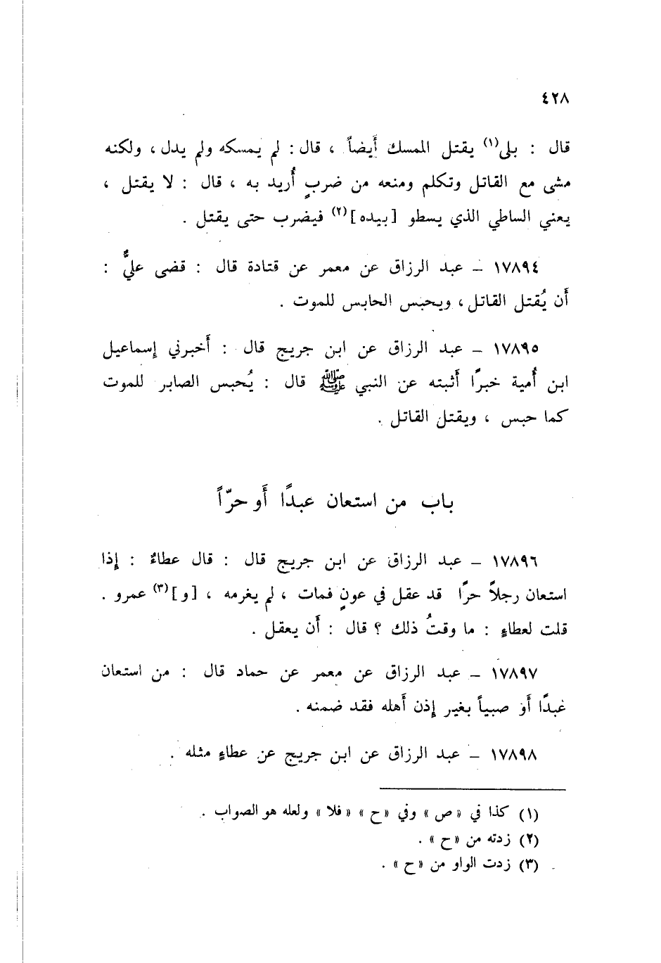 17895 - عَنِ ابْنِ جُرَيْجٍ قَالَ: أَخْبَرَنِي إِسْمَاعِيلُ بْنُ أُمَيَّةَ، خَبَرًا أَثْبَتَهُ عَنِ النَّبِيِّ صَلَّى اللهُ عَلَيْهِ وَسَلَّمَ قَالَ: «§يُحْبَسُ الصَّابِرُ لِلْمَوْتِ كَمَا حَبَسَ وَيُقْتَلُ الْقَاتِلُ»