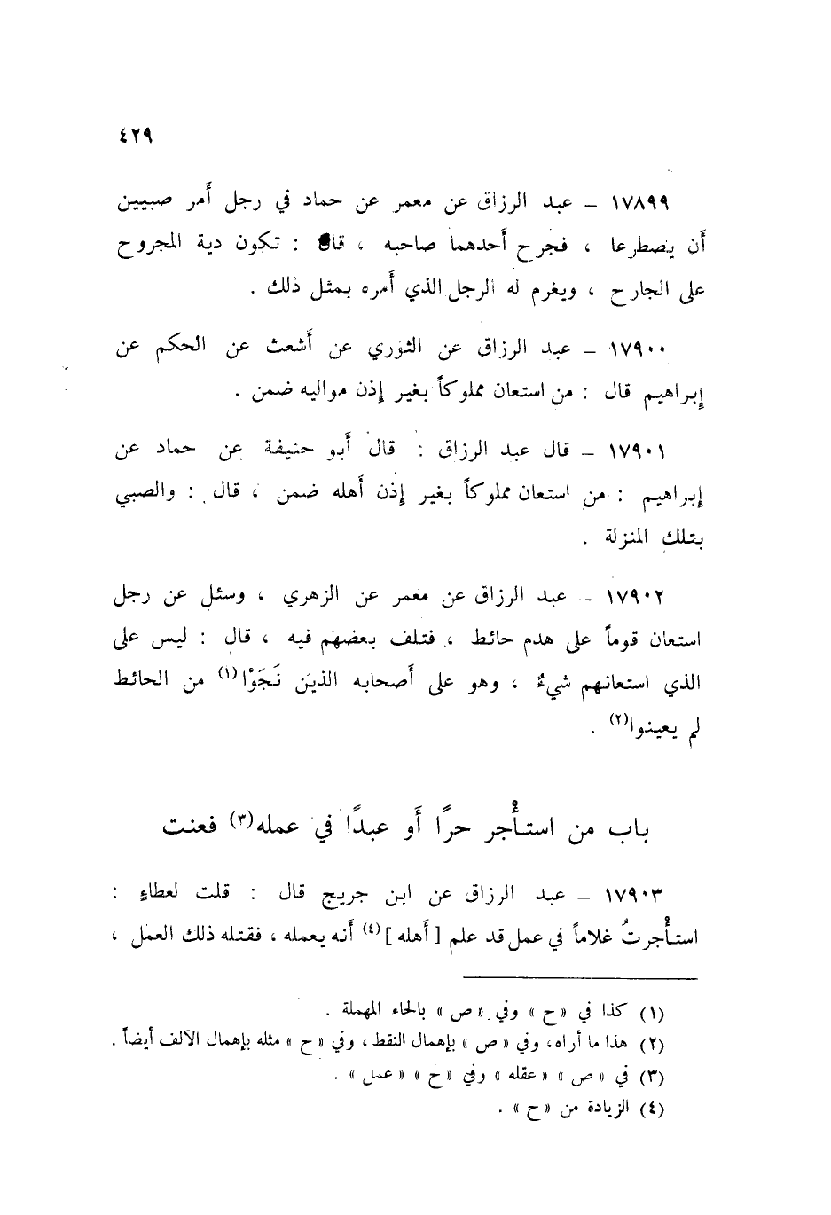 17900 - عَنِ الثَّوْرِيِّ، عَنْ أَشْعَثَ، عَنِ الْحَكَمِ، عَنْ إِبْرَاهِيمَ قَالَ: «§مَنِ اسْتَعَانَ مَمْلُوكًا بِغَيْرِ إِذْنِ مَوَالِيهِ ضَمِنَ»