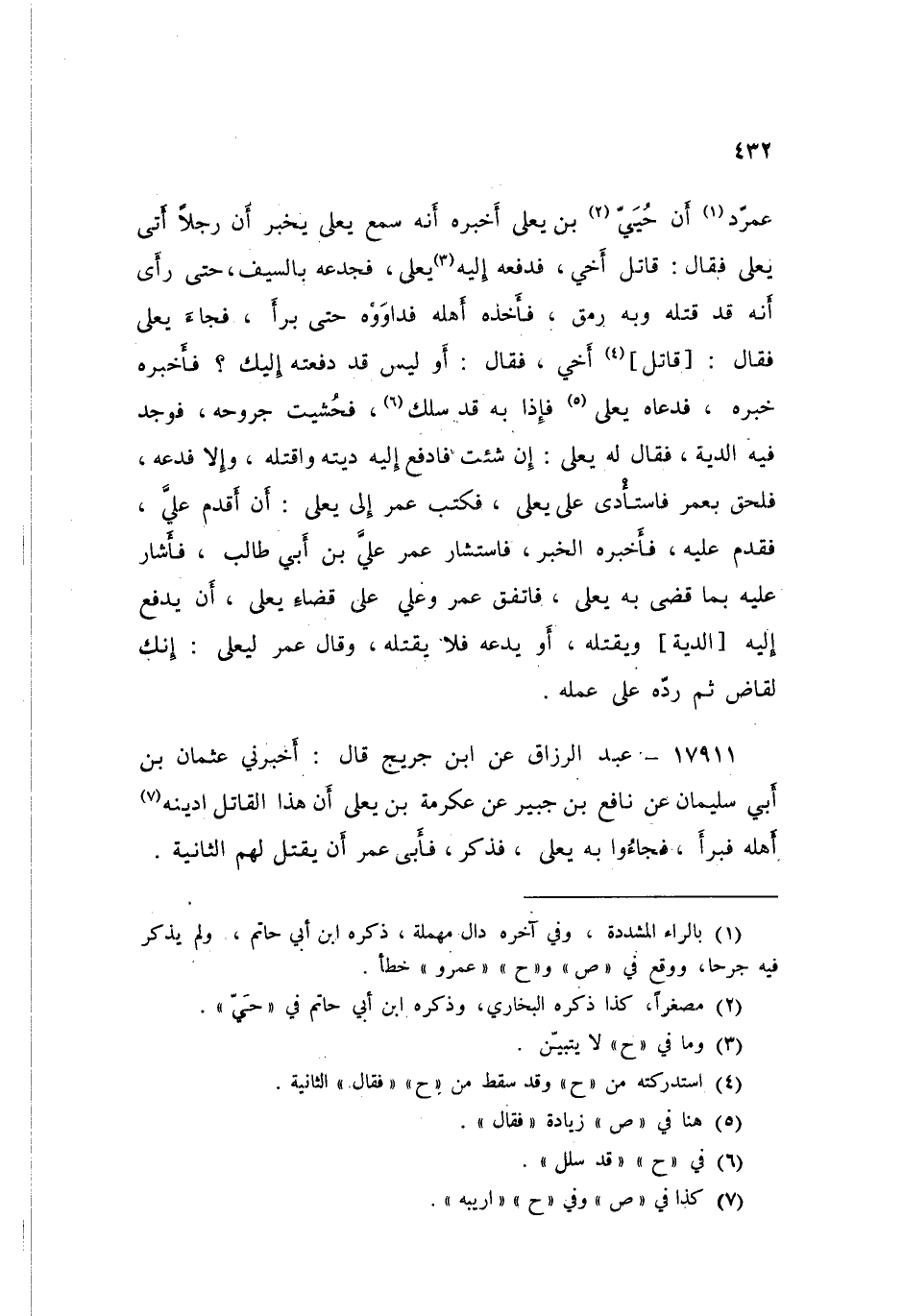 17911 - عَنِ ابْنِ جُرَيْجٍ قَالَ: أَخْبَرَنِي عُثْمَانُ بْنُ أَبِي سُلَيْمَانَ، عَنْ نَافِعِ بْنِ جُبَيْرٍ، عَنْ عِكْرِمَةَ بْنِ يَعْلَى أَنَّ هَذَا الْقَاتِلَ أَدِينَهُ أَهْلُهُ، فَبَرَأَ، فَجَاءُوا بِهِ يَعْلَى، فَذَكَرَ، §فَأَبَى عُمَرُ أَنْ يَقْتُلَ لَهُمُ الثَّانِيَةَ "