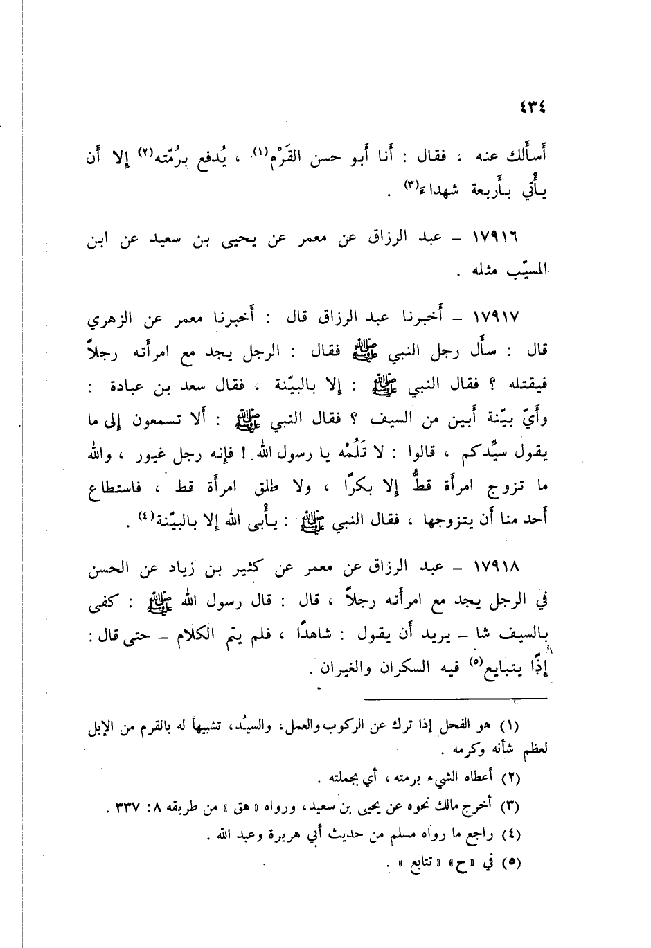 17917 - عَبْدُ الرَّزَّاقِ قَالَ: أَخْبَرَنَا مَعْمَرٌ، عَنِ الزُّهْرِيِّ قَالَ: سَأَلَ رَجُلٌ النَّبِيَّ صَلَّى اللهُ عَلَيْهِ وَسَلَّمَ؟ فَقَالَ الرَّجُلُ: يَجِدُ مَعَ امْرَأَتِهِ رَجُلًا فَيَقْتُلُهُ، فَقَالَ النَّبِيُّ صَلَّى اللهُ عَلَيْهِ وَسَلَّمَ: «إِلَّا بِالْبَيِّنَةِ»، فَقَالَ سَعْدُ بْنُ عُبَادَةَ، وَأَيُّ بَيِّنَةٍ أَبْيَنُ مِنَ السَّيْفِ؟ فَقَالَ النَّبِيُّ صَلَّى اللهُ عَلَيْهِ وَسَلَّمَ أَلَا تَسْمَعُونَ إِلَى مَا يَقُولُ: «سَيِّدُكُمْ» قَالُوا: لَا تَلُمْهُ يَا رَسُولَ اللَّهِ فَإِنَّهُ رَجُلٌ غَيُورٌ، وَاللَّهِ مَا تَزَوَّجَ امْرَأَةً قَطُّ إِلَّا بِكْرًا، وَلَا طَلَّقَ امْرَأَةً قَطُّ، فَاسْتَطَاعَ أَحَدٌ مِنَّا أَنْ يَتَزَوَّجَهَا فَقَالَ النَّبِيُّ صَلَّى اللهُ عَلَيْهِ وَسَلَّمَ: «§يَأْبَى اللَّهُ إِلَّا بِالْبَيِّنَةِ»
