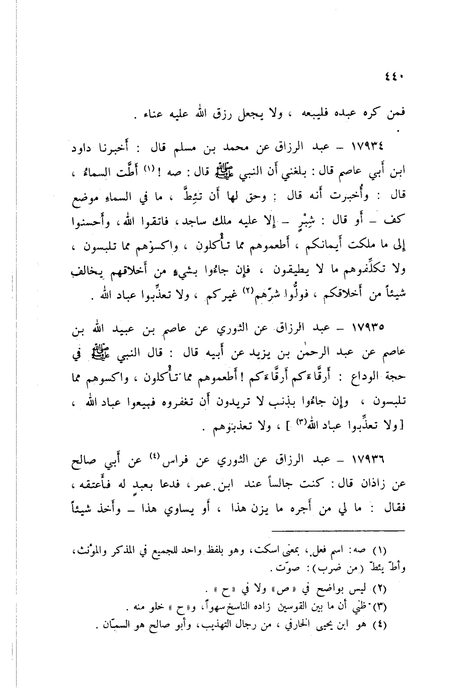 17935 - عَنِ الثَّوْرِيِّ، عَنْ عَاصِمِ بْنِ عُبَيْدِ اللَّهِ بْنِ عَاصِمٍ، عَنْ عَبْدِ الرَّحْمَنِ بْنِ يَزِيدَ، عَنْ أَبِيهِ قَالَ: قَالَ النَّبِيُّ صَلَّى اللهُ عَلَيْهِ وَسَلَّمَ فِي حَجَّةِ الْوَدَاعِ: «§أَرِقَّاءَكُمْ، أَرِقَّاءَكُمْ، أَطْعِمُوهُمْ مِمَّا تَأْكُلُونَ، وَاكْسُوهُمْ مِمَّا تَلْبَسُونَ، وَإِنْ جَاءُوا بِذَنْبٍ لَا تُرِيدُونَ، أَنْ تَغْفِرُوهُ، فَبِيعُوا عِبَادَ اللَّهُ، وَلَا تُعَذِّبُوا عِبَادَ اللَّهُ وَلَا تُعَذِّبُوهُمْ»