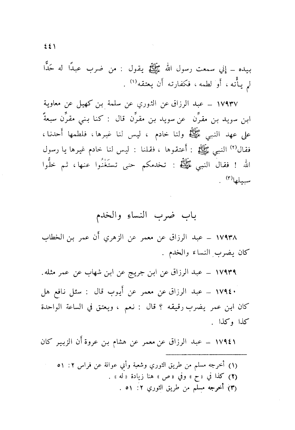 17938 - عَنْ مَعْمَرٍ، عَنِ الزُّهْرِيِّ أَنَّ عُمَرَ بْنَ الْخَطَّابِ §كَانَ يَضْرِبُ النِّسَاءَ وَالْخَدَمَ "، عَبْدُ الرَّزَّاقِ،