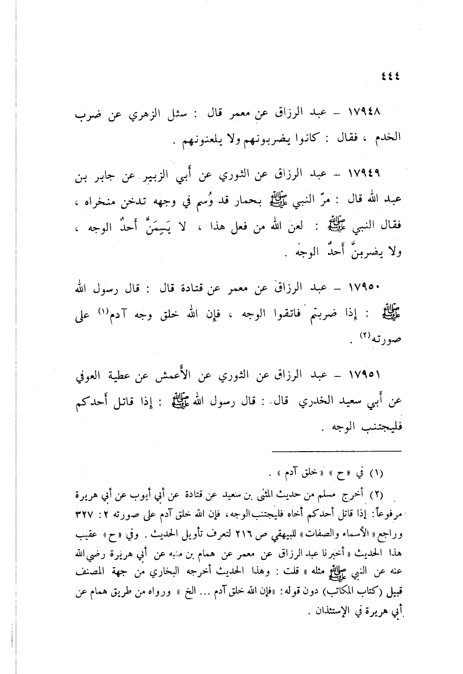 17949 - عَنِ الثَّوْرِيِّ، عَنْ أَبِي الزُّبَيْرِ، عَنْ جَابِرِ بْنِ عَبْدِ اللَّهِ قَالَ: مَرَّ النَّبِيُّ صَلَّى اللهُ عَلَيْهِ وَسَلَّمَ بِحِمَارٍ قَدْ وُسِمَ فِي وَجْهِهِ، تُدَخِّنُ مَنْخِرَاهُ، فَقَالَ النَّبِيُّ صَلَّى اللهُ عَلَيْهِ وَسَلَّمَ: «§لَعَنَ اللَّهُ مَنْ فَعَلَ هَذَا لَا يَسِمَنَّ أَحَدٌ الْوَجْهَ، وَلَا يَضْرِبَنَّ أَحَدٌ الْوَجْهَ»