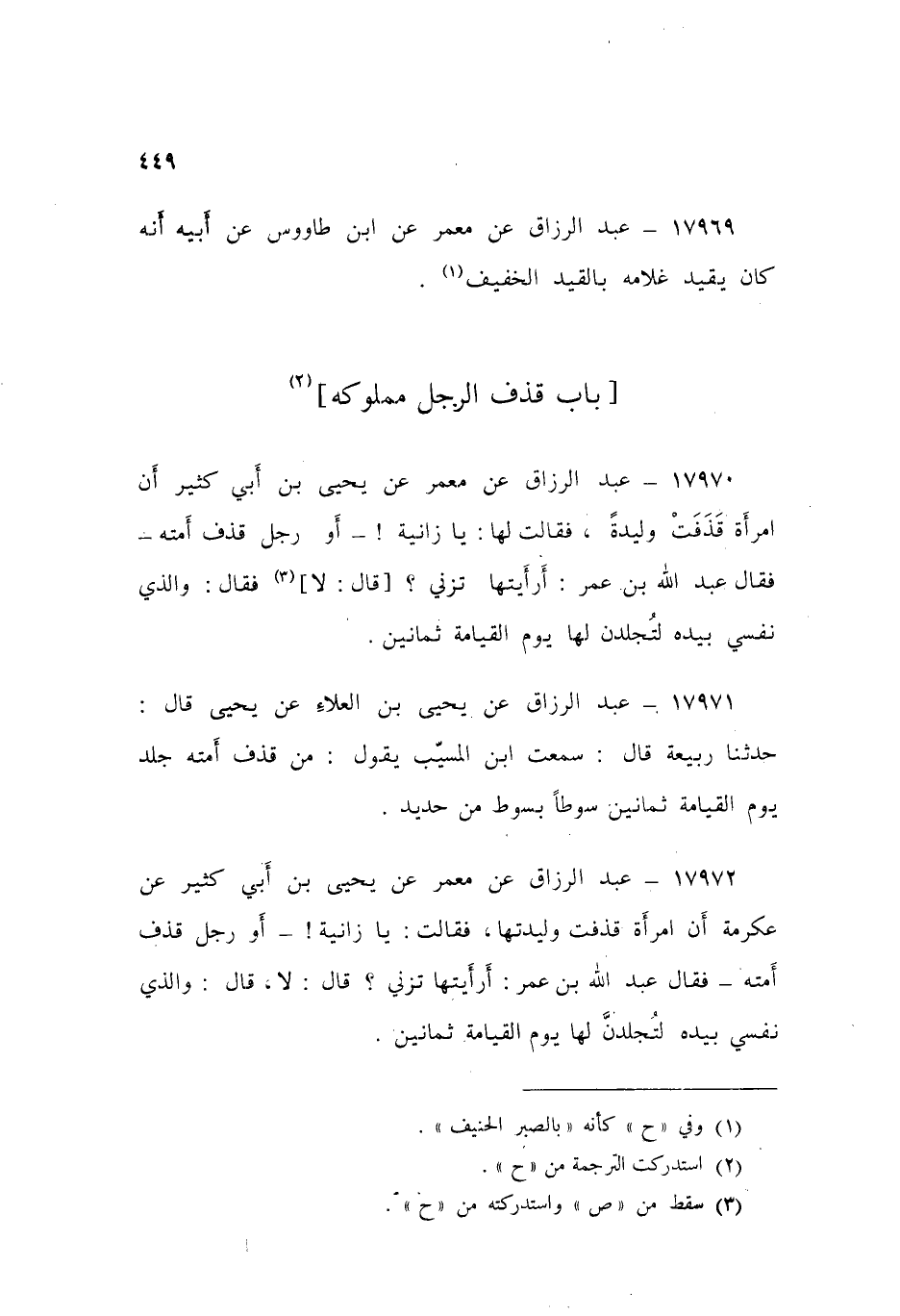 17970 - عَنْ مَعْمَرٍ، عَنْ يَحْيَى بْنِ أَبِي كَثِيرٍ، أَنَّ امْرَأَةً قَذَفَتْ وَلِيدَةً فَقَالَتْ لَهَا: يَا زَانِيَةُ " أَوْ رَجُلٌ قَذَفَ أَمَتَهُ، فَقَالَ عَبْدُ اللَّهِ بْنُ عُمَرَ: «أَرَأَيْتَهَا تَزْنِي؟» قَالَ: لَا، فَقَالَ: «§وَالَّذِي نَفْسِي بِيَدِهِ لَتُجْلَدَنَّ لَهَا يَوْمَ الْقِيَامَةِ ثَمَانِينَ»