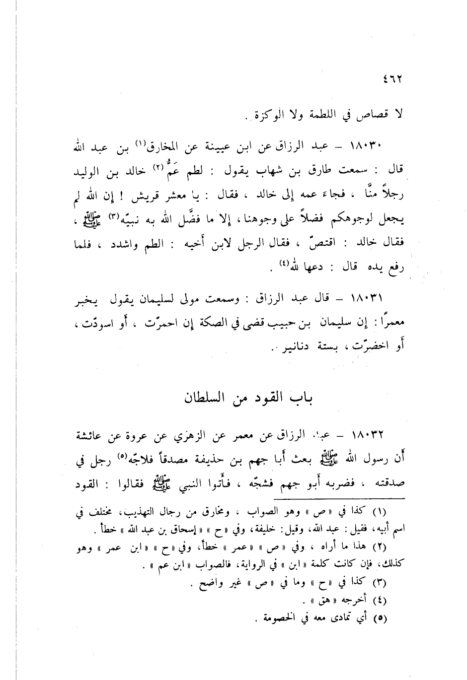 18032 - عَنْ مَعْمَرٍ، عَنِ الزُّهْرِيِّ، عَنْ عُرْوَةَ، عَنْ عَائِشَةَ، أَنَّ رَسُولَ اللَّهِ صَلَّى اللهُ عَلَيْهِ وَسَلَّمَ بَعَثَ أَبَا جَهْمِ بْنِ حُذَيْفَةَ مُصَدِّقًا فَلَاجَّهُ رَجُلٌ فِي صَدَقَتِهِ فَضَرَبَهُ أَبُو جَهْمٍ فَشَجَّهُ، فَأَتَوُا النَّبِيَّ صَلَّى اللهُ عَلَيْهِ وَسَلَّمَ فَقَالُوا: الْقَوَدَ -[463]- يَا رَسُولَ اللَّهِ، فَقَالَ النَّبِيُّ صَلَّى اللهُ عَلَيْهِ وَسَلَّمَ: «لَكُمْ كَذَا وَكَذَا» فَلَمْ يَرْضَوْا قَالَ: «لَكُمْ كَذَا وَكَذَا» فَلَمْ يَرْضَوْا قَالَ: «فَلَكُمْ كَذَا وَكَذَا» فَرَضَوْا، فَقَالَ النَّبِيُّ صَلَّى اللهُ عَلَيْهِ وَسَلَّمَ: «إِنِّي خَاطِبٌ عَلَى النَّاسِ، وَمُخْبِرُهُمْ بِرِضَاكُمْ» قَالُوا: نَعَمْ، فَخَطَبَ النَّبِيُّ صَلَّى اللهُ عَلَيْهِ وَسَلَّمَ فَقَالَ: «§إِنَّ هَؤُلَاءِ اللَّيْثِيِّينَ أَتَوْنِي يُرِيدُونَ الْقَوَدَ فَعَرَضْتُ عَلَيْهِمْ كَذَا وَكَذَا فَرَضُوا أَرَضِيتُمْ؟» قَالُوا: لَا، فَهَمَّ الْمُهَاجِرُونَ بِهِمْ، فَأَمَرَهُمُ النَّبِيُّ صَلَّى اللهُ عَلَيْهِ وَسَلَّمَ أَنْ يَكُفُّوا فَكَفُّوا، ثُمَّ دَعَاهُمْ فَزَادَهُمْ، وَقَالَ: «أَرَضِيتُمْ؟» قَالُوا: نَعَمْ