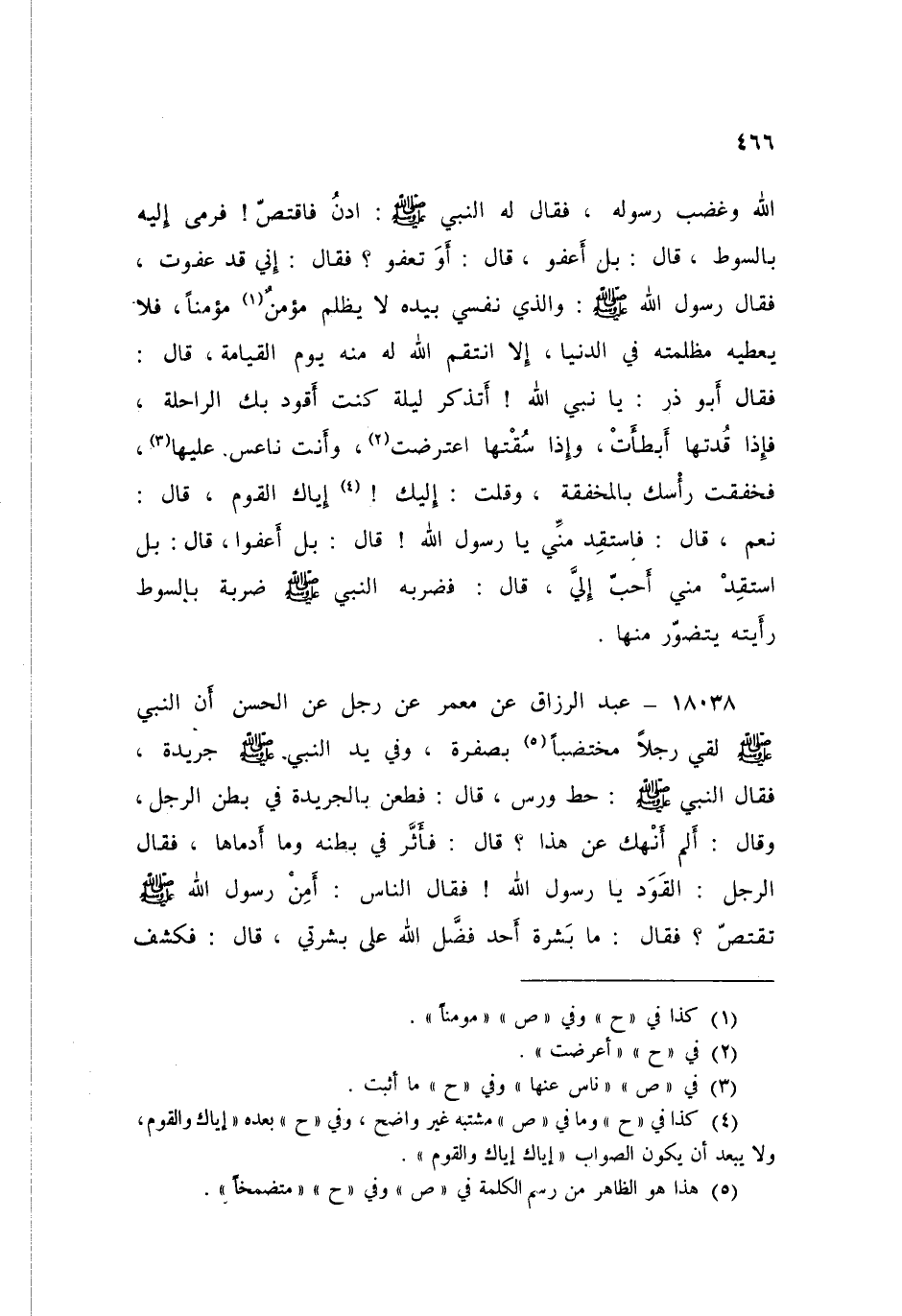 18039 - عَنِ ابْنِ عُيَيْنَةَ، عَنْ عَمْرٍو، عَنِ الْحَسَنِ قَالَ: كَانَ رَجُلٌ مِنَ الْأَنْصَارِ يُقَالُ لَهُ: سَوَادَةُ بْنُ عَمْرٍو يَتَخَلَّقُ كَانَهُ عُرْجُونٌ، وَكَانَ النَّبِيُّ صَلَّى اللهُ عَلَيْهِ وَسَلَّمَ §إِذَا رَآهُ يَعَضُّ لَهُ قَالَ: فَجَاءَ يَوْمًا وَهُوَ مُتَخَلِّقٌ فَأَهْوَى لَهُ النَّبِيُّ صَلَّى اللهُ عَلَيْهِ وَسَلَّمَ بِعُودٍ كَانَ فِي يَدِهِ فَجَرَحَهُ "، فَقَالَ: الْقِصَاصُ يَا رَسُولَ اللَّهِ، فَأَعْطَاهُ الْعُودَ وَكَانَ عَلَى النَّبِيِّ صَلَّى اللهُ عَلَيْهِ وَسَلَّمَ قَمِيصَانِ قَالَ: فَجَعَلَ يَرْفَعُهُمَا قَالَ: «فَنَهَرَهُ النَّاسُ» قَالَ: فَكَشَفَ عَنْهُ حَتَّى انْتَهَى إِلَى الْمَكَانَ الَّذِي جَرَحَهُ فَرَمَى بِالْقَضِيبِ، وَعَلِقَ يُقَبِّلُهُ، وَقَالَ: يَا نَبِيَّ اللَّهُ بَلْ أَدَعُهَا لَكَ تَشْفَعُ لِي بِهَا يَوْمَ الْقِيَامَةِ
