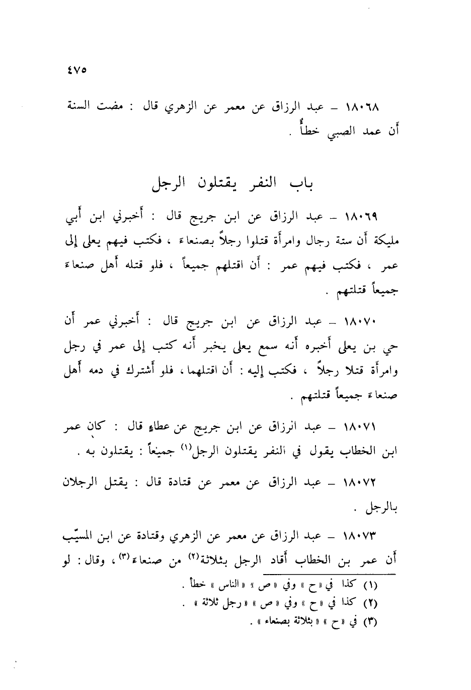 18073 - عَنْ مَعْمَرٍ، عَنِ الزُّهْرِيِّ، وَقَتَادَةَ، عَنِ ابْنِ الْمُسَيِّبِ، أَنَّ عُمَرَ بْنَ الْخَطَّابِ، " §أَقَادَ الرَّجُلَ بِثَلَاثَةٍ مِنْ صَنْعَاءَ، وَقَالَ: لَوْ تَمَالَأَ عَلَيْهِ أَهْلُ صَنْعَاءَ قَتَلْتُهُمْ "، قَالَ الزُّهْرِيُّ: «ثُمَّ مَضَتِ السُّنَّةُ بَعْدَ ذَلِكَ أَلَّا يُقْتَلُ إِلَّا وَاحِدٌ»