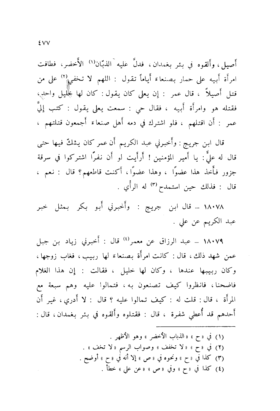 18079 - عَنْ مَعْمَرٍ قَالَ: أَخْبَرَنِي زِيَادُ بْنُ جَبَلٍ، عَمَّنْ شَهِدَ ذَلِكَ قَالَ: كَانَتِ امْرَأَةٌ بِصَنْعَاءَ لَهَا رَبِيبٌ فَغَابَ زَوْجُهَا، وَكَانَ رَبِيبُهَا عِنْدَهَا، وَكَانَ لَهَا خَلِيلٌ، فَقَالَتْ: إِنَّ هَذَا الْغُلَامَ فَاضِحُنَا، فَانْظُرُوا كَيْفَ تَصْنَعُونَ بِهِ؟ فَتَمَالَوْا عَلَيْهِ وَهُمْ سَبْعَةٌ مَعَ الْمَرْأَةِ قَالَ: قُلْتُ لَهُ: كَيْفَ تَمَالَوْا عَلَيْهِ؟ قَالَ: لَا أَدْرِي غَيْرَ أَنَّ أَحَدَهُمْ قَدْ أُعْطِيَ شَفْرَةً قَالَ: فَقَتَلُوهُ وَأَلْقَوْهُ فِي بِئْرٍ بِغَمَدَانَ قَالَ -[478]-: تُفُقِّدَ الْغُلَامُ قَالَ: فَخَرَجَتِ امْرَأَةُ أَبِيهِ تَطُوفُ عَلَى حِمَارٍ، وَهِيَ الَّتِي قَتَلَتْهُ مَعَ الْقَوْمِ، وَهِيَ تَقُولُ: اللَّهُمَّ لَا تُخْفِي دَمَ أَصِيلٍ قَالَ: وَخَطَبَ يَعْلَى النَّاسَ، فَقَالَ: انْظُرُوا هَلْ تُحِسُّونَ هَذَا الْغُلَامَ أَوْ يُذْكَرُ لَكُمْ قَالَ: فَيَمُرُّ رَجُلٌ بِبِئْرِ غَمَدَانَ بَعْدَ أَيَّامٍ، فَإِذَا هُوَ بِذُبِابٍ أَخْضَرَ يَطْلُعُ مَرَّةً مِنَ الْبِئْرِ، وَيَهْبِطُ أُخْرَى، فَأَشْرَفَ عَلَى الْبِئْرِ فَوَجَدَ رِيحًا أَنْكَرَهَا، فَأَتَى يَعْلَى، فَقَالَ: مَا أَظُنُّ إِلَّا أَنِّي قَدْ قَدَرْتُ لَكُمْ عَلَى صَاحِبِكُمْ قَالَ: وَأَخْبَرَهُ الْخَبَرَ قَالَ: فَخَرَجَ يَعْلَى حَتَّى وَقَفَ عَلَى الْبِئْرِ وَالنَّاسُ مَعَهُ قَالَ: فَقَالَ الرَّجُلُ الَّذِي قَتَلَهُ - صَدِيقُ الْمَرْأَةِ -: دَلُّونِي بِحَبْلٍ قَالَ: فَدَلَّوْهُ فَأَخَذَ الْغُلَامَ فَغَيَّبَهُ فِي سِرْبٍ فِي الْبِئْرِ، ثُمَّ قَالَ: ارْفَعُونِي فَرَفَعُوهُ، فَقَالَ: لَمْ أَقْدِرْ عَلَى شَيْءٍ، فَقَالَ الْقَوْمُ: الْآنَ الرِّيحُ مِنْهَا أَشَدُّ مِنْ حِينَ جِئْنَا، فَقَالَ رَجُلٌ آخَرُ: دَلُّونِي فَلَمَّا أَرَادُوا أَنْ يُدَلُّوهُ أَخَذَتِ الْآخَرَ رِعْدَةٌ فَاسْتَوْثَقُوا مِنْهُ، وَدَلَّوْا صَاحِبَهُمْ فَلَمَّا هَبَطَ فِيهَا اسْتَخْرَجَهُ إِلَيْهِمْ، ثُمَّ خَرَجَ، فَاعْتَرَفَ الرَّجُلُ خَلِيلُ الْمَرْأَةِ، وَاعْتَرَفْتِ الْمَرْأَةُ، وَاعْتَرَفُوا كُلُهُمْ، فَكَتَبَ يَعْلَى إِلَى عُمَرَ -[479]-، فَكَتَبَ إِلَيْهِ أَنِ اقْتُلْهُمْ، فَلَوْ تَمَالَأَ بِهِ أَهْلُ صَنْعَاءَ قَتَلْتُهُمْ قَالَ: «§فَقَتَلَ السَّبْعَةَ»