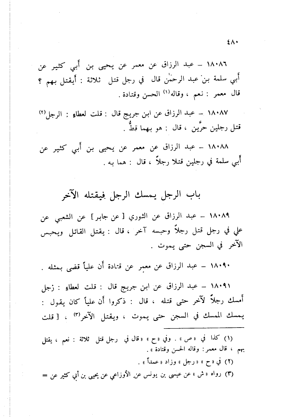 18091 - عَنِ ابْنِ جُرَيْجٍ قَالَ: قُلْتُ لِعَطَاءٍ: رَجُلٌ أَمْسَكَ رَجُلًا لِآخَرَ حَتَّى قَتَلَهُ قَالَ: ذَكَرُوا أَنَّ عَلِيًّا كَانَ يَقُولُ: «§يُمْسَكُ الْمُمْسِكُ فِي السِّجْنِ حَتَّى يَمُوتَ، وَيُقْتَلُ الْآخَرُ»، قُلْتُ لِعَطَاءٍ: إِنْ بَلَغَ مِنْهُ شَيْئًا دُونَ نَفْسِهِ أَيُمْسَكُ الْمُمْسِكُ فِي السِّجْنِ حَتَّى يَمُوتَ؟ قَالَ: «لَا يُقَادُ مِنَ السَّاطِي وَيُعَاقَبُ الْمُمْسِكُ، وَلَا يُقَادُ مِنْهُ»، قُلْتُ: فَإِنْ قَتَلَهُ قَتْلًا؟ قَالَ: «فَلَا أَرَى أَنْ يُقْتَلَ الْمُمْسِكُ أَيْضًا» قَالَ: قُلْتُ لَهُ: لِمَ يُمْسِكْهُ، وَلَمْ يَدُلَّ عَلَيْهِ، وَلَكِنَّهُ مَشَى مَعَ الْقَاتِلِ فَذَهَبَ، وَتَكَلَّمَ، وَمَنْعَهُ مِنْ ضَرْبٍ أُرِيدَ بِهِ؟ قَالَ: «لَا يُقْتَلُ»