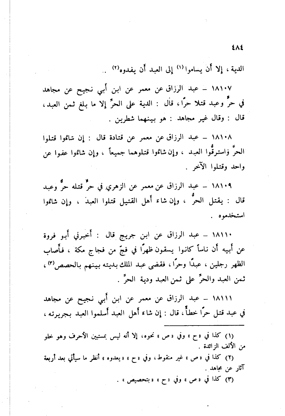 18111 - عَنْ مَعْمَرٍ، عَنِ ابْنِ أَبِي نَجِيحٍ، عَنْ مُجَاهِدٍ فِي عَبْدٍ قَتَلَ حُرًّا خَطَأً قَالَ: «§إِنْ شَاءَ أَهْلُ الْعَبْدِ، أَسْلَمُوا الْعَبْدَ بِجَرِيرَتِهِ، وَإِنْ شَاءُوا فَدَوْهُ بِدِيَةِ الْحُرِّ»