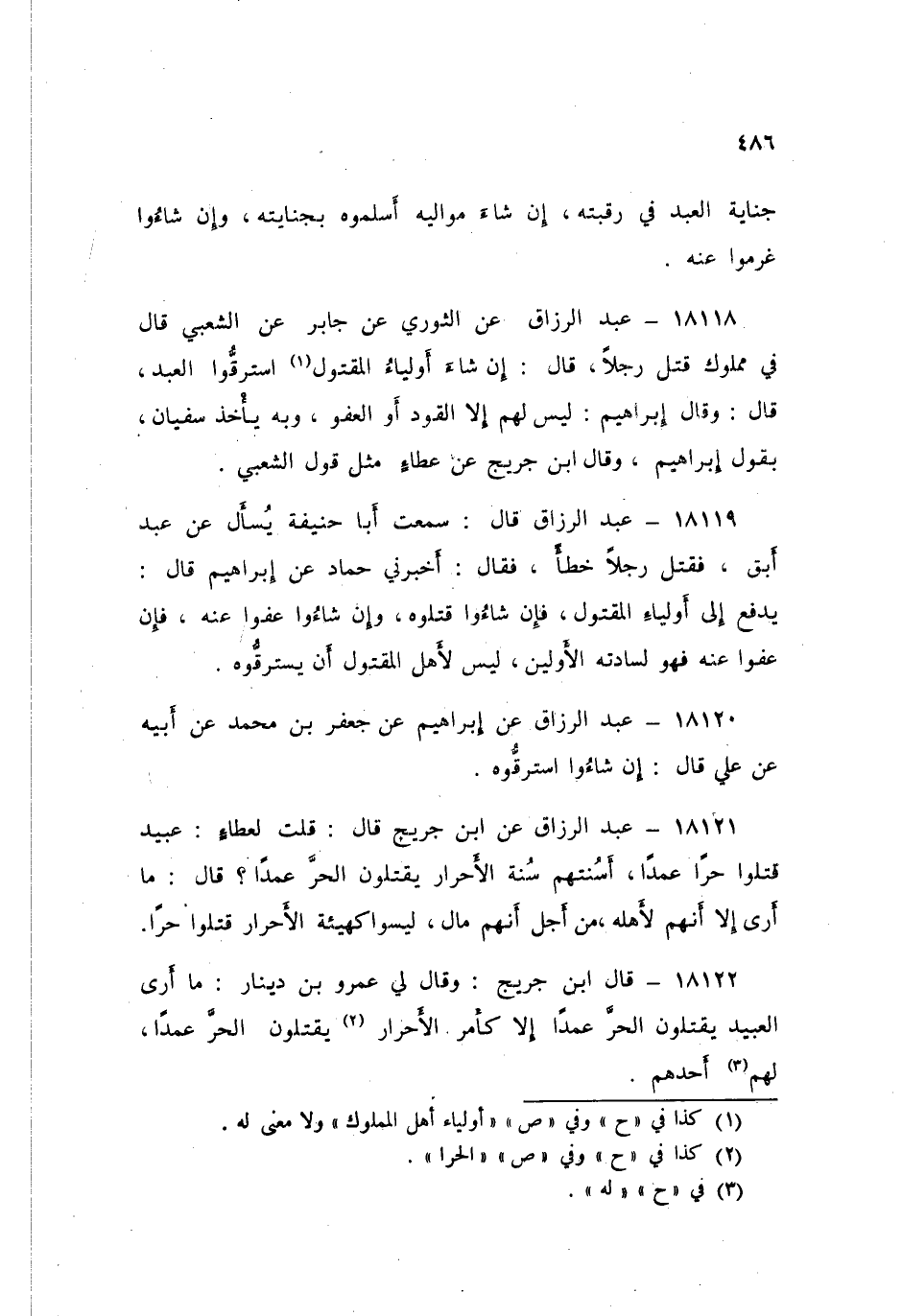 18121 - عَنِ ابْنِ جُرَيْجٍ قَالَ: قُلْتُ لِعَطَاءٍ عَبِيدٌ: قَتَلُوا حُرًّا عَمْدًا أَسُنَّتُهُمْ سُنَّةُ الْأَحْرَارِ يَقْتُلُونَ الْحُرَّ عَمْدًا؟ قَالَ: «§مَا أَرَى إِلَّا أَنَّهُمْ لِأَهْلِهِ مِنْ أَجْلِ أَنَّهُمْ مَالٌ، لَيْسُوا كَهَيْئَةِ الْأَحْرَارِ قَتَلُوا حُرًّا»