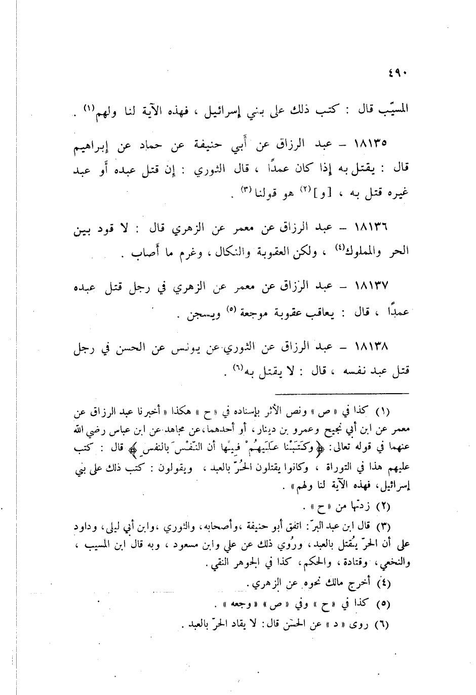 18136 - عَنْ مَعْمَرٍ، عَنِ الزُّهْرِيِّ قَالَ: «§لَا قَوَدَ بَيْنَ الْحُرِّ وَالْمَمْلُوكِ، وَلَكِنِ الْعُقُوبَةَ، وَالنَّكَالَ وَغُرْمَ مَا أَصَابَ»