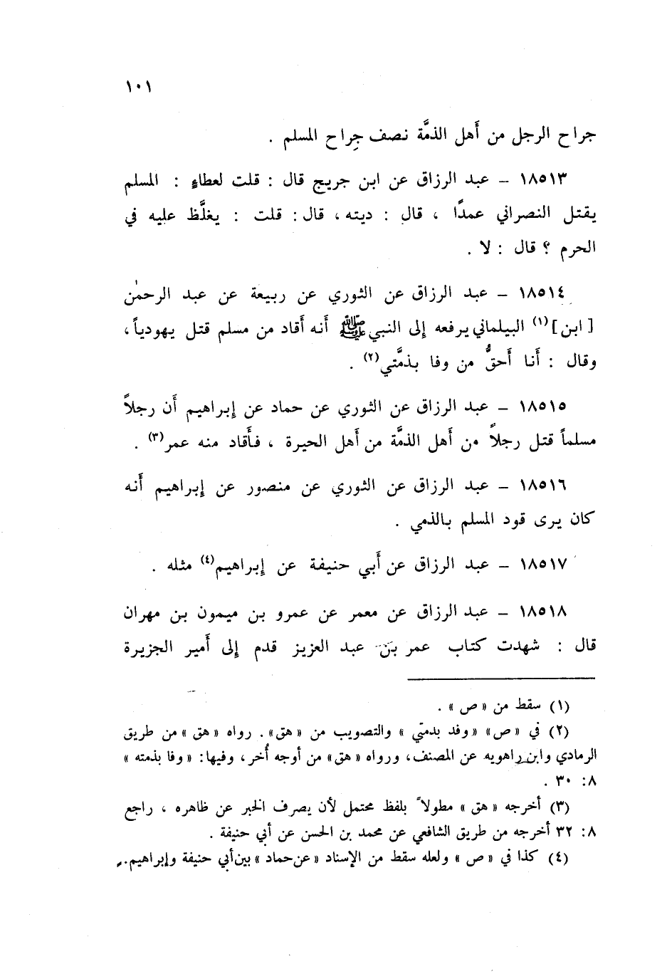 18516 - عَنِ الثَّوْرِيِّ , عَنْ مَنْصُورٍ , عَنْ إِبْرَاهِيمَ: «§أَنَّهُ كَانَ يَرَى قَوَدَ الْمُسْلِمِ بِالذِّمِّيِّ»، عَبْدُ الرَّزَّاقِ،
