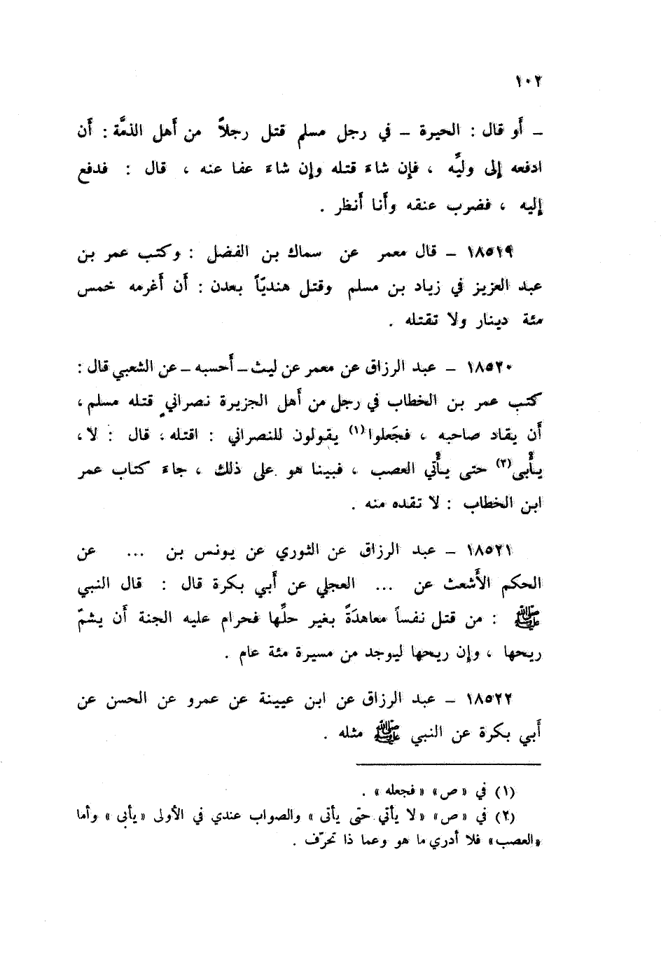 18521 - عَنِ الثَّوْرِيِّ , عَنْ يُونُسَ بْنِ. . . , عَنِ الْحَكَمِ الْأَشْعَثِ , عَنْ. . . الْعِجْلِيِّ , عَنِ أَبِي بَكْرَةَ , قَالَ: قَالَ النَّبِيُّ صَلَّى اللهُ عَلَيْهِ وَسَلَّمَ: «§مَنْ قَتَلَ نَفْسًا مُعَاهَدَةً بِغَيْرِ حِلِّهَا فَحَرَامٌ عَلَيْهِ الْجَنَّةُ أَنْ يَشُمَّ رِيحَهَا وَإِنَّ رِيحَهَا لَيُوجَدُ مِنْ مَسِيرَةِ مِائَةِ عَامٍ»، عَبْدُ الرَّزَّاقِ،