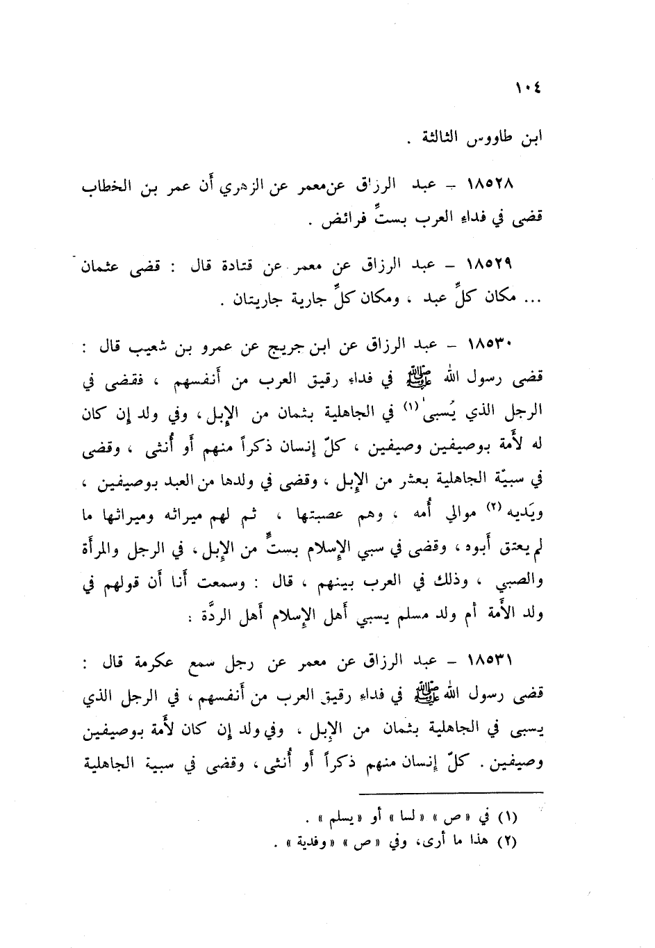 18530 - عَنِ ابْنِ جُرَيْجٍ , عَنْ عَمْرِو بْنِ شُعَيْبٍ , قَالَ: «§قَضَى رَسُولُ اللَّهِ صَلَّى اللهُ عَلَيْهِ وَسَلَّمَ فِي فِدَاءِ رَقِيقِ الْعَرَبِ مِنْ أَنْفُسِهِمْ فَقَضَى فِي الرَّجُلِ الَّذِي يُسْبَى فِي الْجَاهِلِيَّةِ بِثَمَانٍ مِنَ الْإِبِلِ , وَفِي وَلَدٍ إِنْ كَانَ لَهُ لِأَمَةٍ بِوَصِيفَيْنِ وَصِيفَيْنِ , كُلِّ إِنْسَانٍ ذَكَرًا مِنْهُمْ أَوْ أُنْثَى , وَقَضَى فِي سَبِيَّةِ الْجَاهِلِيَّةِ بِعَشْرٍ مِنَ الْإِبِلِ , وَقَضَى فِي وَلَدِهَا مِنَ الْعَبْدِ بِوَصِيفَيْنِ وَيَدِيهِ مَوَالِي أُمِّهِ وَهُمْ عَصَبَتُهَا ثُمَّ لَهُمْ مِيرَاثُهُ وَمِيرَاثُهَا مَا لَمْ يُعْتَقْ أَبُوهُ وَقَضَى فِي سَبْيِ الْإِسْلَامِ بِسِتٍّ مِنَ الْإِبِلِ فِي الرَّجُلِ وَالْمَرْأَةِ وَالصَّبِيِّ، وَذَلِكَ فِي الْعَرَبِ بَيْنَهُمْ» قَالَ وَسَمِعْتُ أَنَا: «أَنَّ قَوْلَهُمْ فِي وَلَدِ الْأَمَةِ أُمِّ وَلَدٍ مُسْلِمٍ يَسْبِي أَهْلُ الْإِسْلَامِ أَهْلَ الرِّدَّةِ»