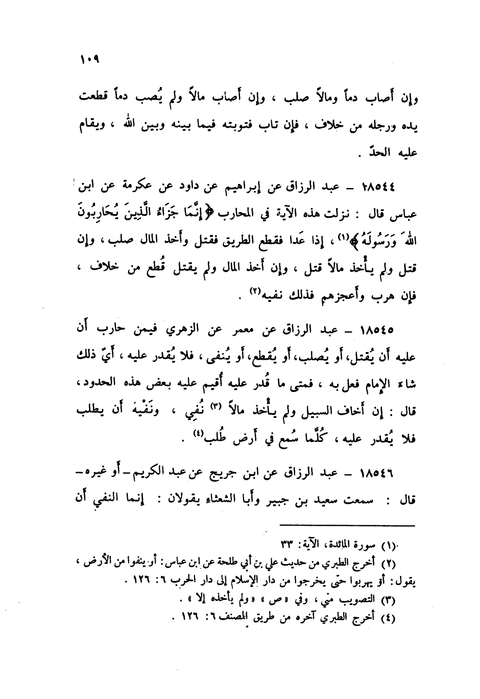 18545 - عَنْ مَعْمَرٍ , عَنِ الزُّهْرِيِّ , فِيمَنْ حَارَبَ أَنَّ عَلَيْهِ أَنْ يُقْتَلَ , أَوْ يُصْلَبَ , أَوْ يُقْطَعَ , أَوْ يُنْفَى , فَلَا يُقْدَرُ عَلَيْهِ , أَيُّ ذَلِكَ شَاءَ الْإِمَامُ فَعَلَ بِهِ , فَمَتَى مَا قُدِرَ عَلَيْهِ , أُقِيمَ عَلَيْهِ بَعْضُ هَذِهِ الْحُدُودِ قَالَ: «§إِنْ أَخَافَ السَّبِيلَ وَلَمْ يَأْخُذْ مَالًا , نُفِيَ وَنَفْيُهُ أَنْ يُطْلَبَ , فَلَا يُقْدَرَ عَلَيْهِ , كُلَّمَا سُمِعَ فِي أَرْضٍ طُلِبَ»
