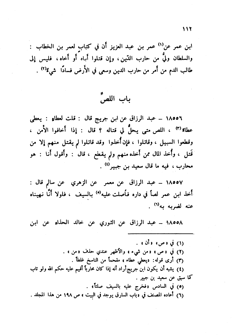 18556 - عَنِ ابْنِ جُرَيْجٍ , قَالَ: قُلْتُ لِعَطَاءٍ: §اللِّصُّ مَتَى يَحِلُّ لِي قِتَالُهُ؟ قَالَ: «إِذَا أَخَافُوا الْأَمْنَ , وَقَطَعُوا السَّبِيلَ , وَقَاتَلُوا , فَإِنْ أُخِذُوا وَقَدْ قَاتَلُوا , لَمْ يُقْتَلْ مِنْهُمْ إِلَّا مَنْ قَتَلَ , وَأُخِذَ الْمَالُ مِمَّنْ أَخَذَهُ مِنْهُمْ , وَلَمْ يُقْطَعْ» قَالَ: وَأَقُولُ أَنَا: «هُوَ مُحَارِبٌ فِيهِ مَا قَالَ سَعِيدُ بْنُ جُبَيْرٍ»
