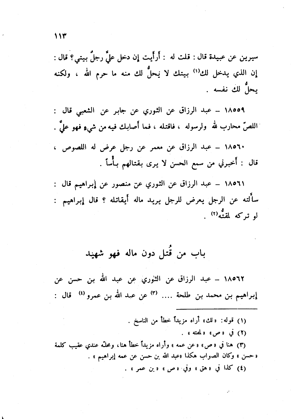 18562 - عَنِ الثَّوْرِيِّ , عَنْ عَبْدِ اللَّهِ بْنِ حَسَنٍ , عَنْ إِبْرَاهِيمَ بْنِ مُحَمَّدِ بْنِ طَلْحَةَ , عَنْ عَبْدِ اللَّهِ بْنِ عَمْرٍو , قَالَ: قَالَ رَسُولُ اللَّهِ صَلَّى اللهُ عَلَيْهِ وَسَلَّمَ: «§مَنْ أُرِيدَ مَالُهُ بِغَيْرِ حَقٍّ , فَقَاتَلَ فَقُتِلَ فَهُوَ شَهِيدٌ»