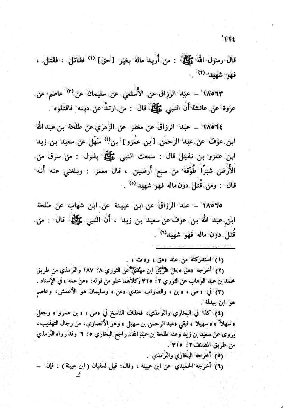 18565 - عَنِ ابْنِ عُيَيْنَةَ , عَنِ ابْنِ شِهَابٍ , عَنْ طَلْحَةَ بْنِ عَبْدِ اللَّهِ بْنِ عَوْفٍ , عَنْ سَعِيدِ بْنِ زَيْدٍ , أَنَّ النَّبِيَّ صَلَّى اللهُ عَلَيْهِ وَسَلَّمَ قَالَ: «§مَنْ قُتِلَ دُونَ مَالِهِ فَهُوَ شَهِيدٌ»