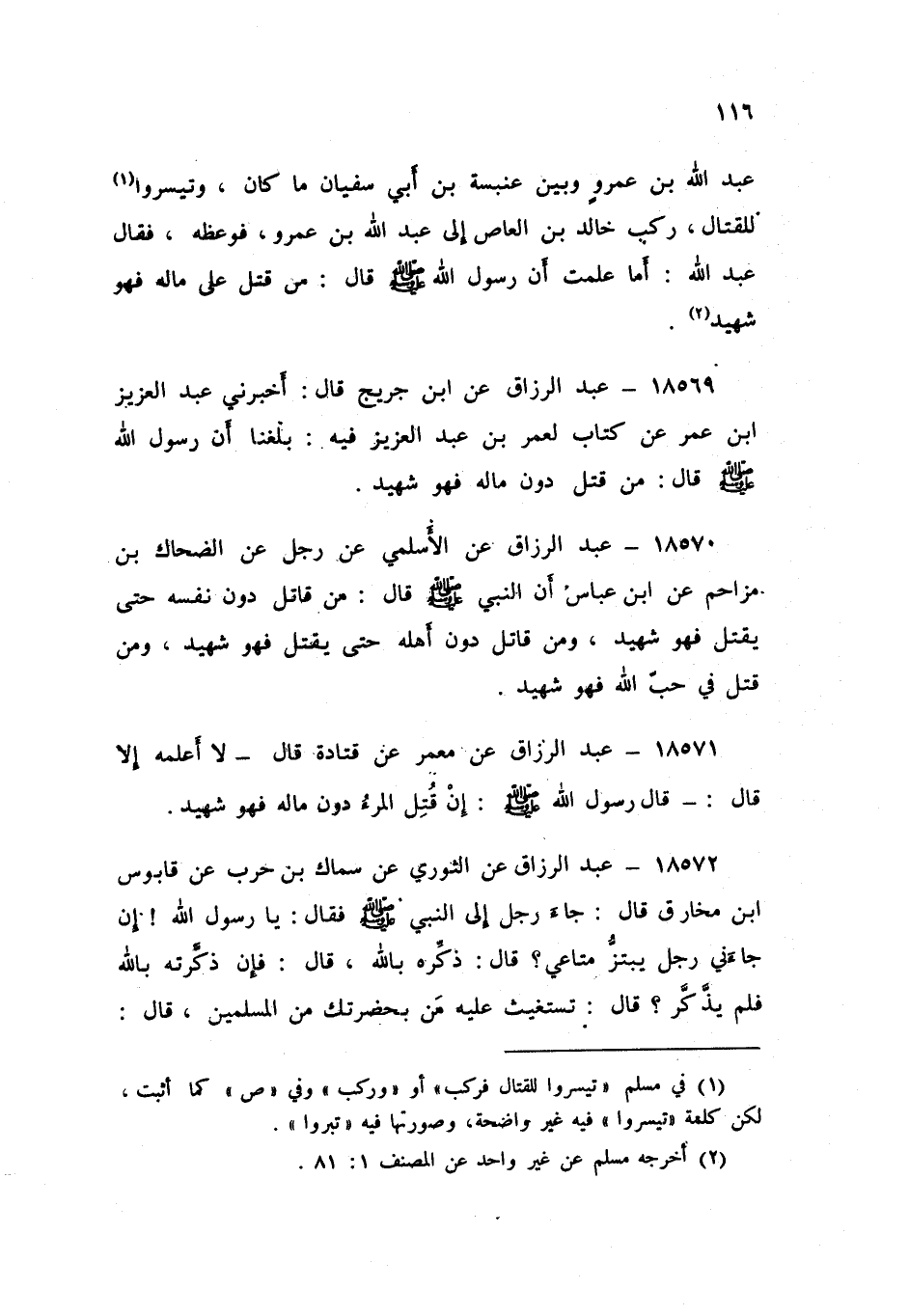 18571 - عَنْ مَعْمَرٍ , عَنْ قَتَادَةَ , قَالَ: لَا أَعْلَمُهُ إِلَّا قَالَ: قَالَ رَسُولُ اللَّهِ صَلَّى اللهُ عَلَيْهِ وَسَلَّمَ: «§إِنْ قُتِلَ الْمَرْءُ دُونَ مَالِهِ فَهُوَ شَهِيدٌ»