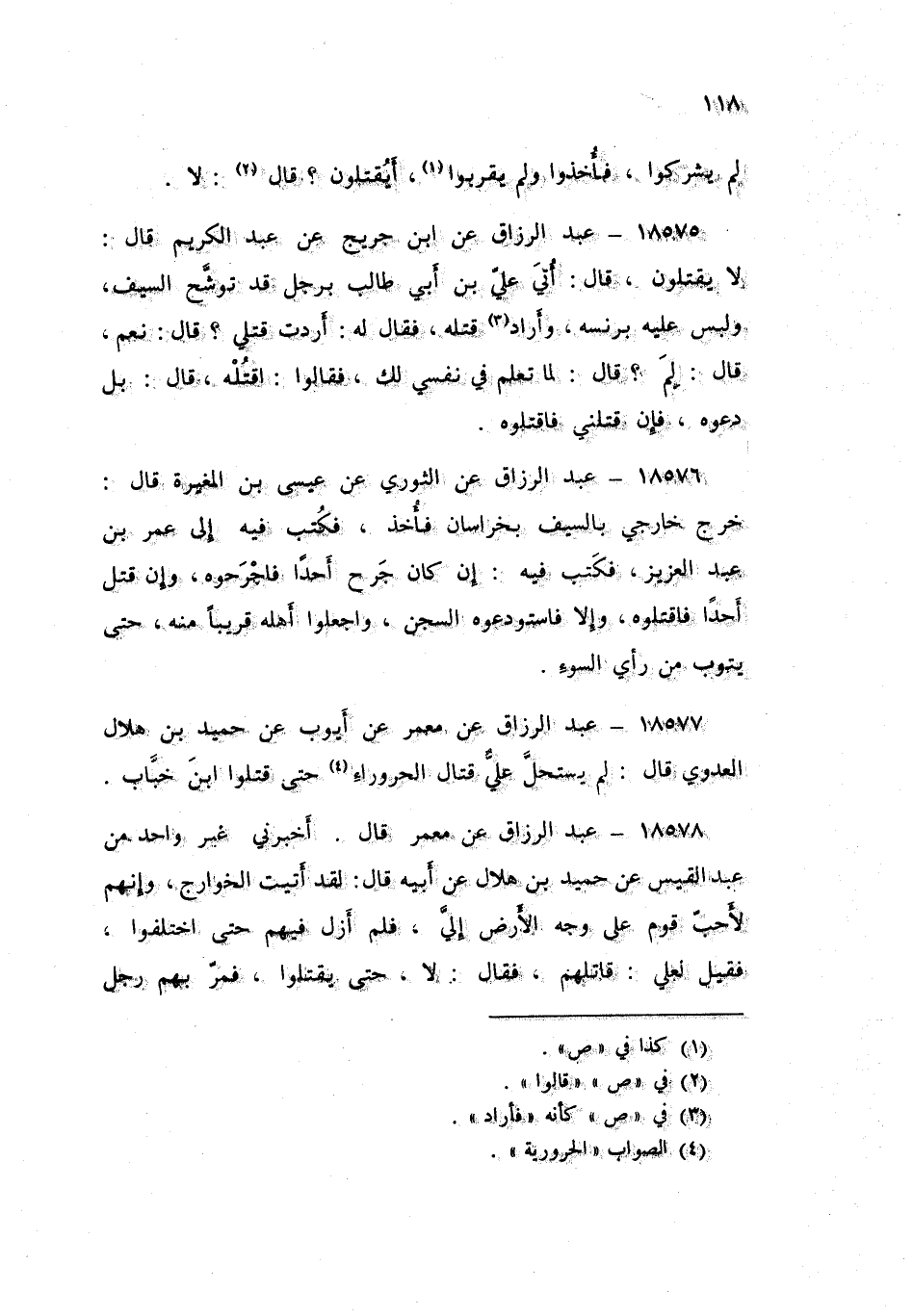 18577 - عَنْ مَعْمَرٍ , عَنْ أَيُّوبَ , عَنْ حُمَيْدِ بْنِ هِلَالٍ الْعَدَوِيِّ , قَالَ: «§لَمْ يَسْتَحِلَّ عَلِيٌّ قِتَالَ الْحَرُورِيَّةِ حَتَّى قَتَلُوا ابْنَ خَبَّابٍ»