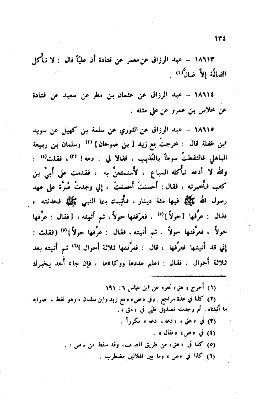 18615 - عَنِ الثَّوْرِيِّ , عَنْ سَلَمَةَ بْنِ كُهَيْلٍ , عَنْ سُوَيْدِ بْنِ غَفَلَةَ , قَالَ: خَرَجْتُ مَعَ زَيْدِ بْنِ صُوحَانَ وَسَلْمَانَ بْنِ رَبِيعَةَ الْبَاهِلِيِّ فَالْتَقَطْتُ سَوْطًا بِالْعُذَيْبِ فَقَالَا لِي: دَعْهُ , فَقُلْتُ: وَاللَّهِ لَا أَدَعُهُ تَأْكُلُهُ السِّبَاعُ لَأَسْتَمْتِعَنَّ بِهِ فَقَدِمْتُ عَلَى أُبَيِّ بْنِ كَعْبٍ فَأَخْبَرْتُهُ، فَقَالَ: أَحْسَنْتَ أَحْسَنْتَ إِنِّي وَجَدْتُ صُرَّةً عَلَى عَهْدِ رَسُولِ اللَّهِ صَلَّى اللهُ عَلَيْهِ وَسَلَّمَ فِيهَا مِائَةُ دِينَارٍ فَأَتَيْتُ بِهَا النَّبِيَّ صَلَّى اللهُ عَلَيْهِ وَسَلَّمَ فَحَدَّثْتُهُ فَقَالَ: " §عَرِّفْهَا حَوْلًا , فَعَرَّفْتُهَا حَوْلًا , ثُمَّ أَتَيْتُهُ , فَقَالَ: «عَرِّفْهَا حَوْلًا» فَعَرَّفْتُهَا حَوْلًا , ثُمَّ أَتَيْتُهُ , فَقَالَ: «عَرِّفْهَا حَوْلًا» فَقُلْتُ: إِنِّي قَدْ أَتَيْتُهَا فَعَرِّفْهَا قَالَ: فَعَرَّفْتُهَا ثَلَاثَةَ أَحْوَالٍ , ثُمَّ أَتَيْتُهُ بَعْدَ ثَلَاثَةِ أَحْوَالٍ , فَقَالَ: «أَعْلِمْ عَدَدَهَا , وَوِكَاءَهَا , فَإِنْ جَاءَ أَحَدٌ يُخْبِرُكُ -[135]- بِعِدَّتِهَا , وَوِعَائِهَا , وَوِكَائِهَا , فَادْفَعْهَا إِلَيْهِ , وَإِلَّا فَاسْتَمْتِعْ بِهَا»