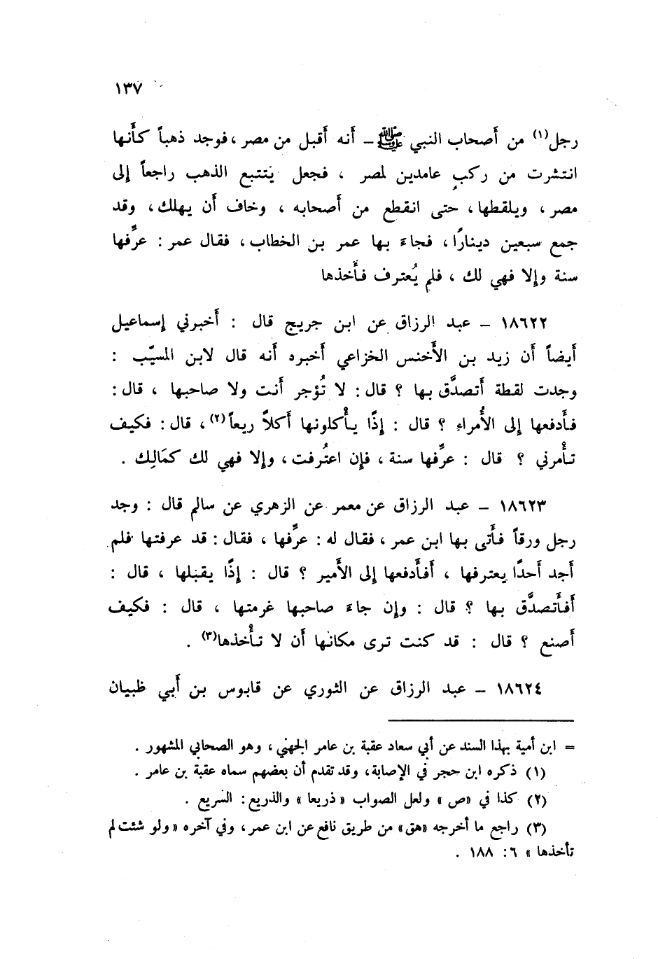 18623 - عَنْ مَعْمَرٍ , عَنِ الزُّهْرِيِّ , عَنْ سَالِمٍ , قَالَ: وَجَدَ رَجُلٌ وَرِقًا فَأَتَى بِهَا ابْنَ عُمَرَ فَقَالَ لَهُ: «§عَرِّفْهَا» فَقَالَ: قَدْ عَرَّفْتُهَا فَلَمْ أَجِدْ أَحَدًا يَعْتَرِفُهَا أَفَأَدْفَعُهَا إِلَى الْأَمِيرِ؟ قَالَ: «إِذًا يَقْبَلُهَا» قَالَ: أَفَأَتَصَدَّقُ بِهَا؟ قَالَ: «وَإِنْ جَاءَ صَاحِبُهَا , غَرِمْتَهَا» قَالَ: فَكَيْفَ أَصْنَعُ؟ قَالَ: «قَدْ كُنْتَ تَرَى مَكَانَهَا أَنْ لَا تَأْخُذَهَا»
